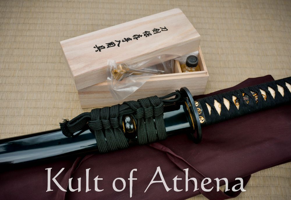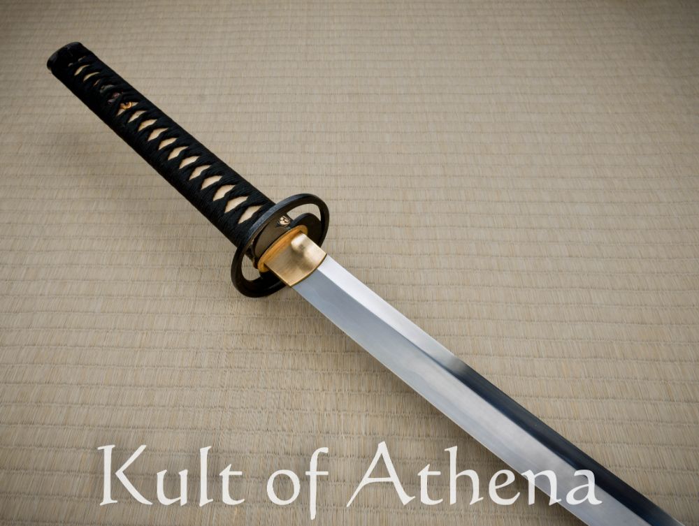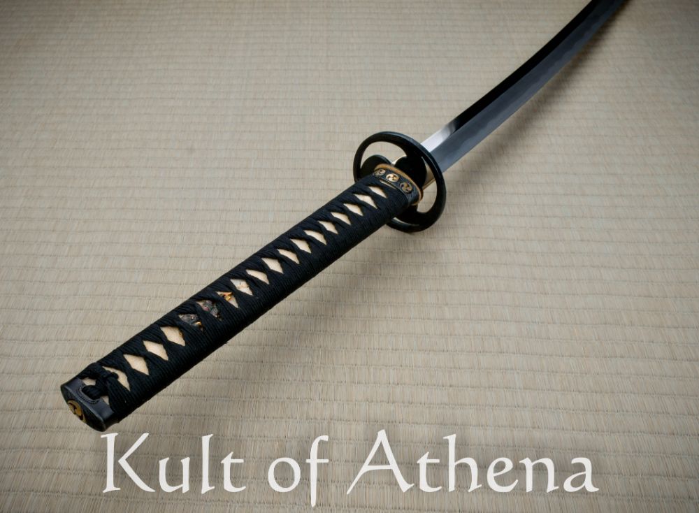 The Paul Chen Great Wave (Tsunami ) Katana features a sharpened hand forged high carbon steel blade, genuine rayskin handle with black cord wrap, and black iron tsuba. Includes matching scabbard, cloth storage sleeve and traditional maintenance kit.