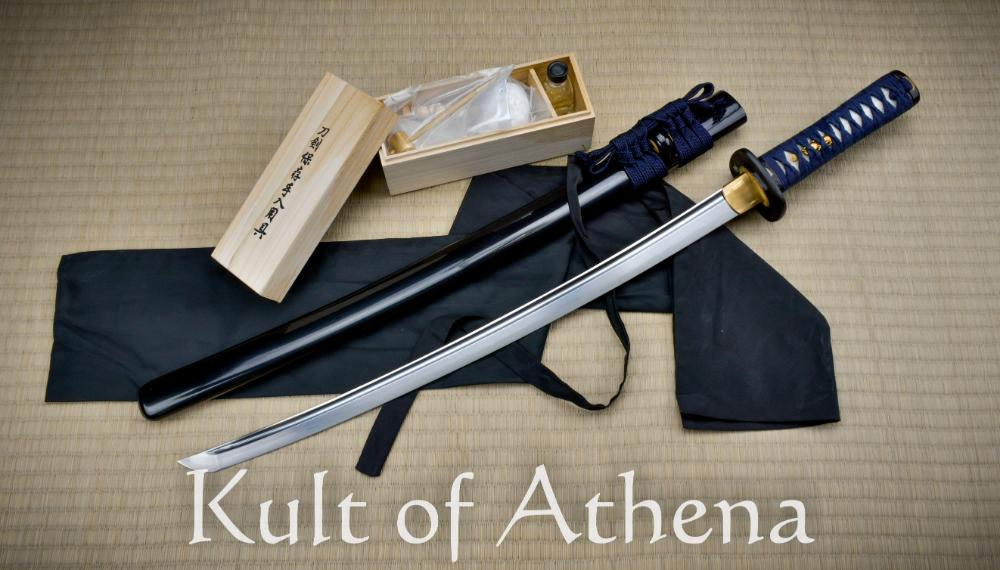 The wood tsuka handle is covered in white rayskin and wrapped with dark blue Tsuka-Ito of Japanese cotton. Turtle and crab menuki lie beneath the ito wrapping. The tsuka fittings are pinned in place with traditional bamboo mekugi, their removal allows for maintenance disassembly and customization. The wood saya scabbard is finished on deep black lacquer. Its kojiri, koiguchi and kurikata fittings are of polished buffalo horn. A silk sageo of dark blue and gray-green is knotted onto the saya. The sword comes with a black cloth sword bag and a wood-boxed traditional maintenance kit.