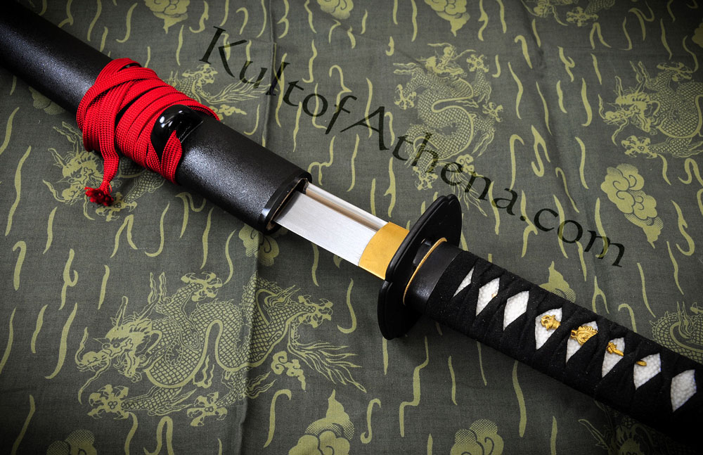 The saya scabbard is black lacquered wood with horn koiguchi and kojiri fittings. It is paired with a red sageo cord and left unknotted so that it is ready for practical wear.