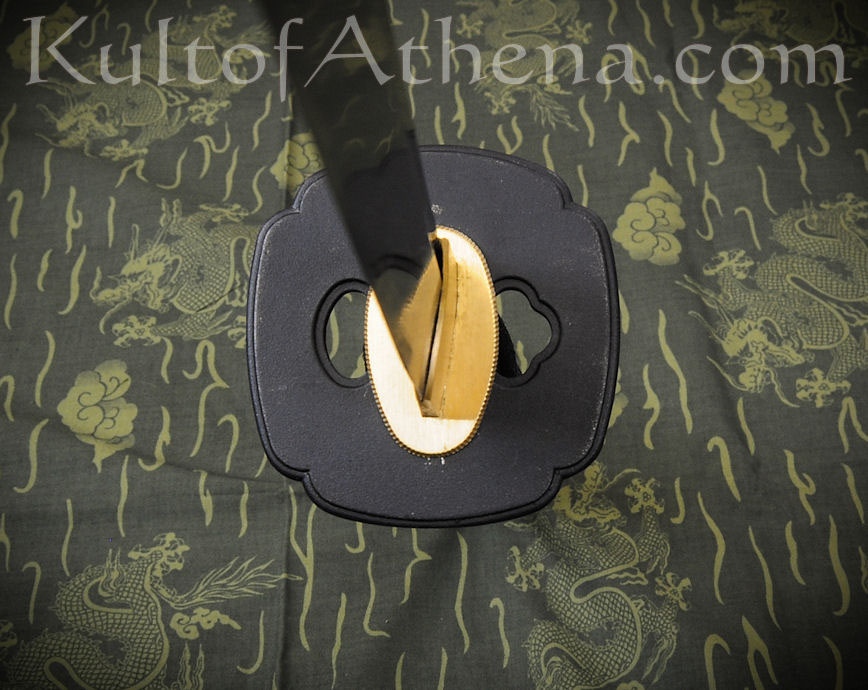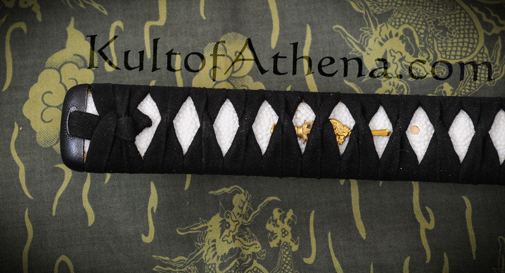 The tsuba, fuchi and kashira hilt fittings are iron and the habaki and seppa are brass. The wooden tsuka grip is paneled with faux rayskin and overlaid with knotted black suede leather tsuka-ito cord. A pair of brass menuki are wrapped within the folds of the ito.