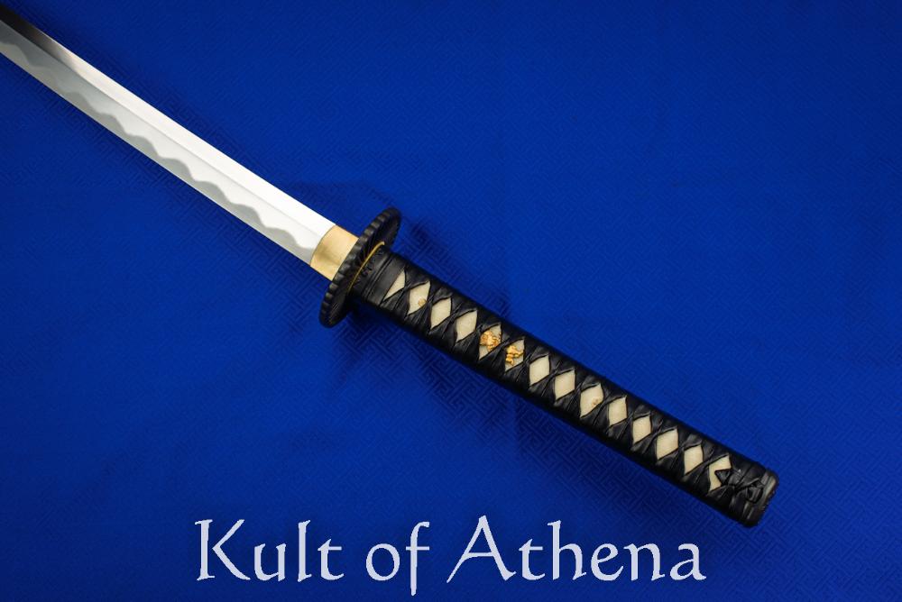 Now produced at the Dragon King Forge in Dalian by Hanwei’s original artisans under Frenchie Jin, the retooled koshirae hilt fittings—tsuba, fuchi, kashira, and menuki—feature a crisp, elegant Japanese Dogwood motif with dragon menuki and an iron sunburst tsuba and are paired with a brass habaki to evoke the aesthetic of heirloom Japanese originals. The blade with a a 3/4-inch sori, is expertly clay-tempered to a 60 HRc edge and 40 HRc back and showcase a prominent hamon for both durability and striking beauty. The 11.25-inch tsuka, wrapped in genuine rayskin and a specially developed tsuka-ito for superior grip, is double-pegged for additional durability. The included wood and lacquer saya (scabbard) completes the traditional package (note: sageo cord color may vary).