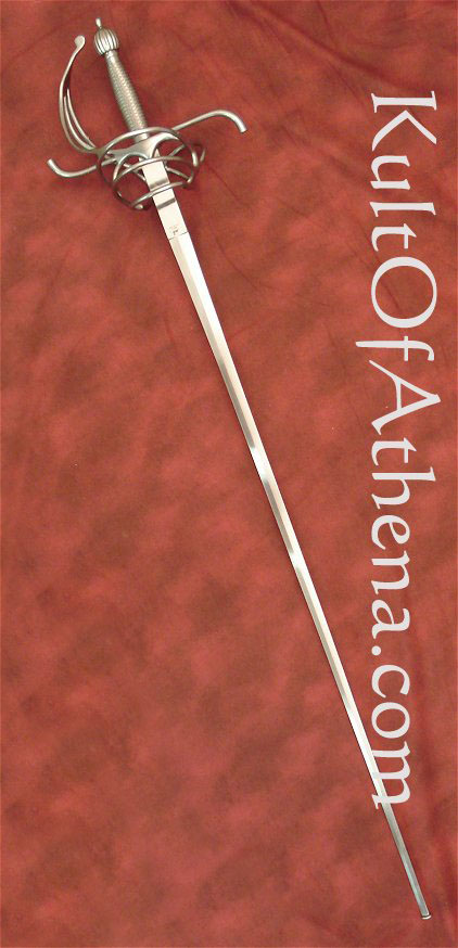 The Practical Rapier has an SCA-approved 37 inch Schlager blade. The tapered blade form provides superior balance compared to the traditional parallel-sided schlagers of the same length, making for a faster sword. The high-carbon steel blade provides good flexibility and is button-tipped for safety. The hilt features solid steel construction with a wire wrapped grip. No scabbard available.