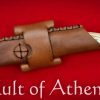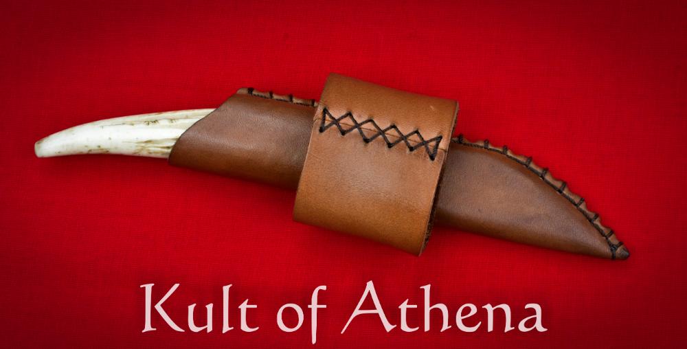 The knife is paired with a thick leather sheath with stitched construction that is arranged for the traditional manner of wearing a seax horizontally at the belt.