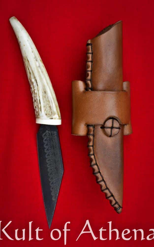 This Hanwei Viking Seax is sized just right to make it a ready and easily carried utility knife for everyday Viking chores and tasks. Despite being optimized for detail handiwork, the knife doubles as a capable self defense tool if the need arises. The sharpened blade is crafted from tempered 65 Mn High Carbon Steel with antiqued finish and surface etchings done in the style of pattern welding. The blade is mounted into a grip crafted from stag horn – please note that as the horn is an organic material, the exacting appearance of each individual seax will vary.