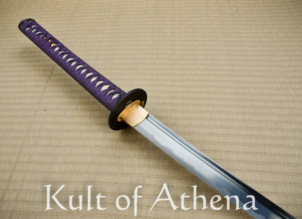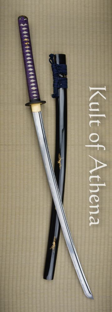 The Tonbo Katana is hand-forged and folded from powder steel. It has a chu-kissaki tip. The tsuka (handle) is covered with high-quality same(rayskin). The tsuka-ito wrap over the tsuka is premium purple Japanese cotton. The fuchi and kashira (end cap) are black with bronze/brass details. The tsuba is of black iron, with dragonfly detailing in bronze and gold. Above it is brass habaki. The saya (scabbard) is of black lacquer emblazoned with golden dragonflies. The kojiri, koiguchi, and kurikata detailing on the saya are made from polished buffalo horn. It comes with a woven dark blue and black sageo.