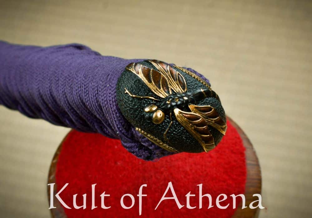Adorned with dragonflies, this katana evokes its imagery from the long-revered insect. An older name for Japan is Akitsushima or Dragonfly Island a reference to the swarms of dragonflies that dart about the rice paddies. Inspired by the agile speed of the dragonfly, Samurai named it Kachimushi (Victory Insect). Seeking to capture its qualities, samurai often adorned their armor and weapons with it. In likewise fashion this katana takes its name and imagery from the Victory Insect.