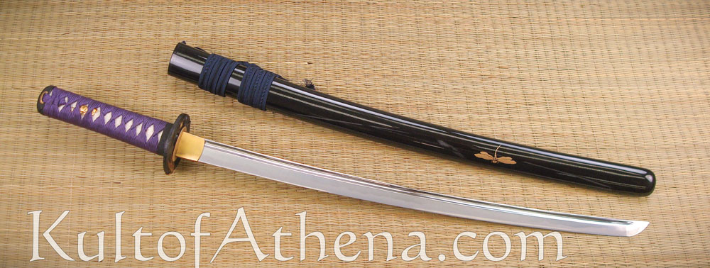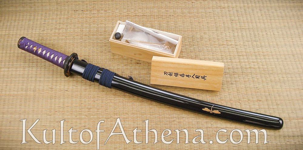 The Tonbo Wakizashi is hand-forged and folded from powder steel. It has a chu-kissaki tip and a bo-hi groove. The differential hardening of the blade gives it a very visible hamon.