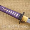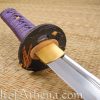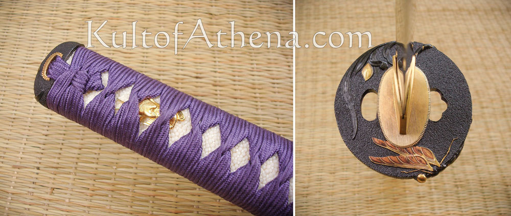 The tsuka (handle) is covered with high-quality same(rayskin). The tsuka-ito wrap over the tsuka is premium purple Japanese cotton. The fuchi and kashira (end cap) are black with bronze/brass details. The tsuba is of black iron, with dragonfly detailing in both bronze and gold. Above it is brass habaki and it is surmounted by seppa of brass. The saya (scabbard) is of black lacquer emblazoned with golden dragonflies. The kojiri, koiguchi, and kurikata detailing on the saya are made from polished buffalo horn. It comes with a woven dark blue and black sageo.