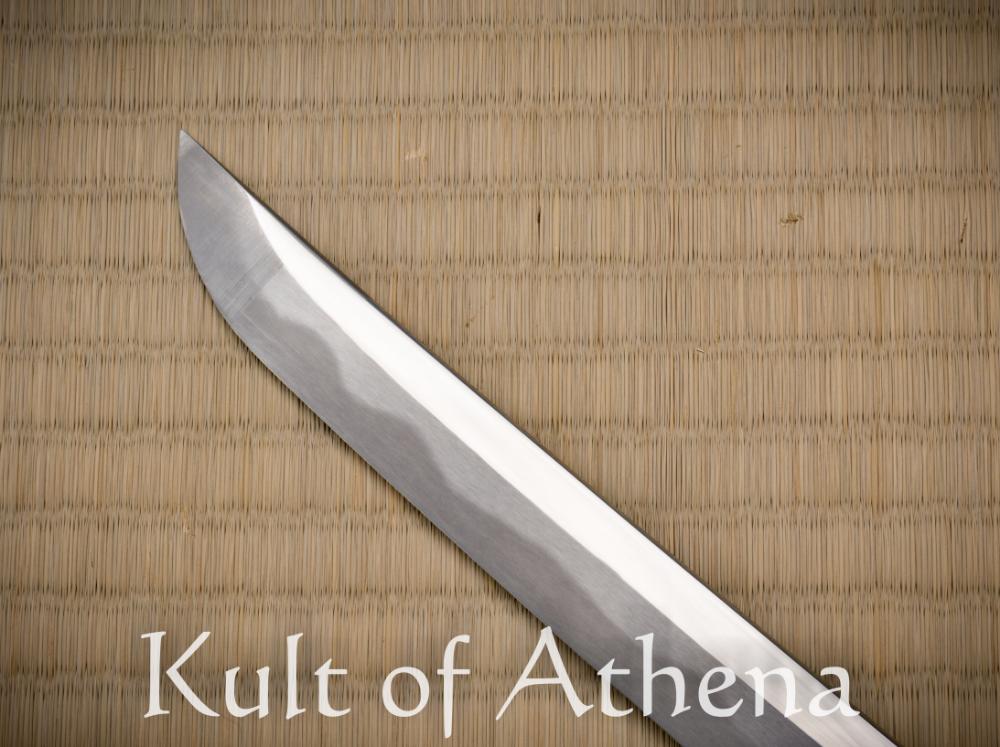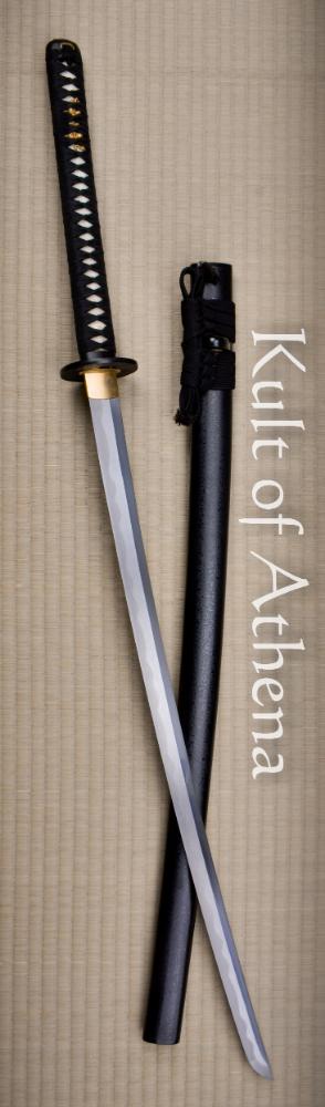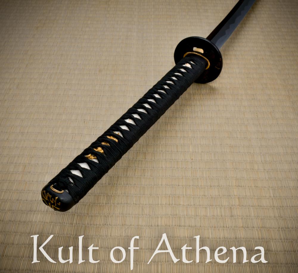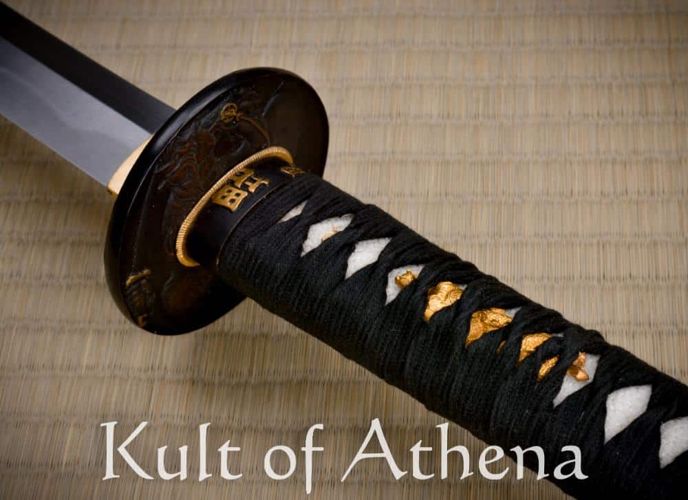 The Hanwei Uesugi Katana pays homage to legendary Japanese feudal warlord Uesugi Kenshin with this finely crafted katana. Its blade is forged from T10 high carbon steel which was clay tempered in the traditional manner to imbue the sword with a genuine hamon of hardened steel which was highlighted with a fine final blade polish. The antiqued brass tsuba features in bold detail and relief the the daimyo himself, upon a galloping warhorse, sword drawn and ready to fall in the strike. Detailing on the fuchi, kashira and menuki are picked out in gold detailing. The habaki and seppa are brass and the long wood tsuka grip is fitted with panels of inlaid rayskin and bound in well knotted black tsuka-ito cord. The sword is completed with a well carved saya of textured black lacquer with a knotted tsuka-ito cord and polished buffalo horn fittings for the koiguchi, kojiri and kurikata.