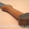 The Scramasax, carried by the Saxons and Vikings between the 4th and 10th centuries, was utilized as both a tool and a weapon. Carried horizontally at the back of the belt, the Scramasax provided the spearman with a close-quarters weapon when needed, and it’s broad blade could handle many day-to-day chores. The ancestry of the Scramasax, which evolved from similar weapons in bronze (and later iron) used by the Celts, is portrayed in the decoration of the guard and pommel.