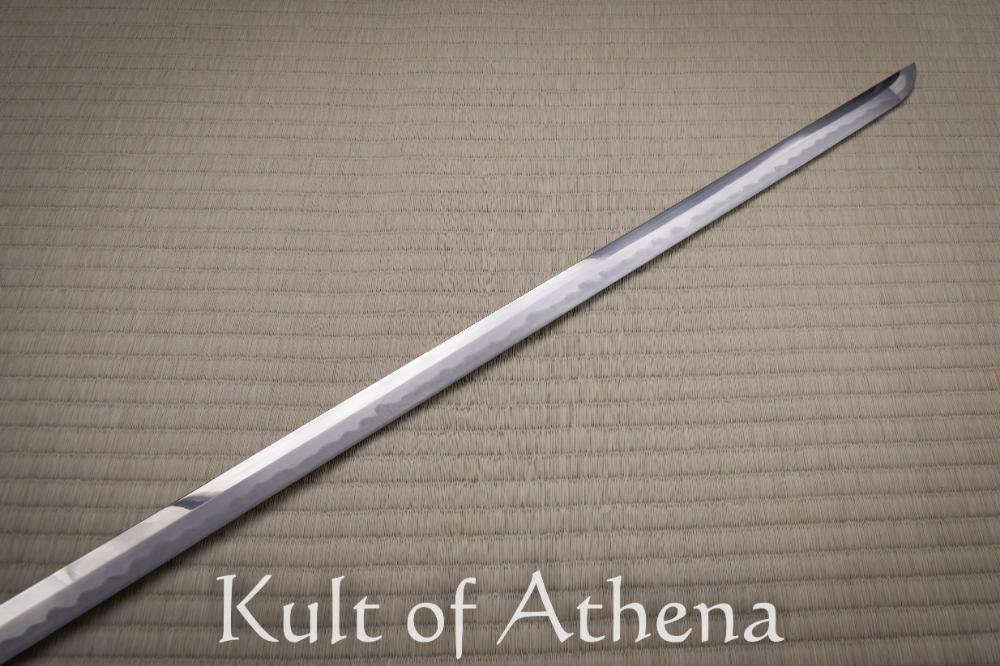 The blade measures approximately 29 inches in length and is forged and tempered for durability and cutting capability with a hardness of 60 HRc at the edge and a blade body and spine at a shock absorbing 40 HRc. Weighing only about 1 lb 11 oz the sword has a pronounced point of balance at roughly 7 inches from the guard and the sword exhibits a distinctly forward-driven feel that enhances cutting authority while maintaining impressive agility due to its light overall weight. This balance profile gives the blade a swift, responsive character well suited for fluid draw cuts and controlled handling.