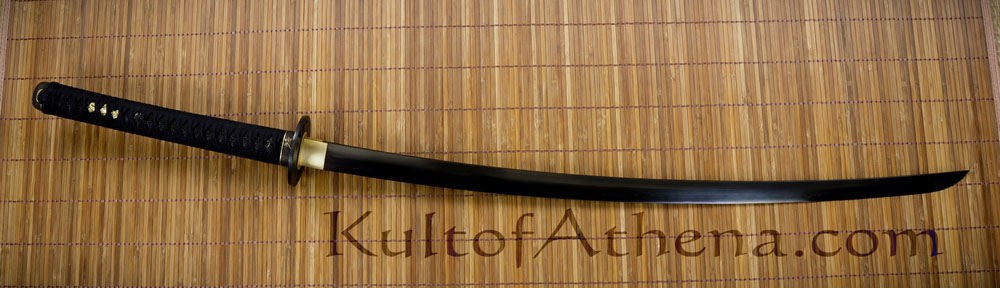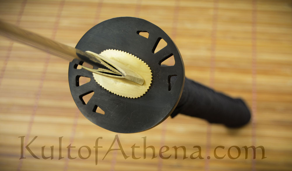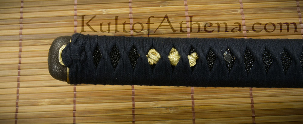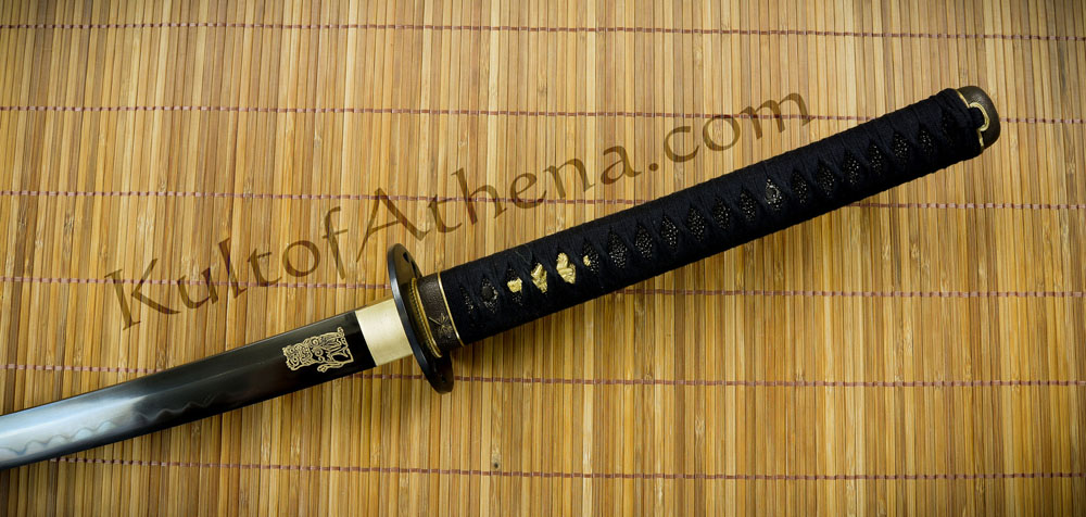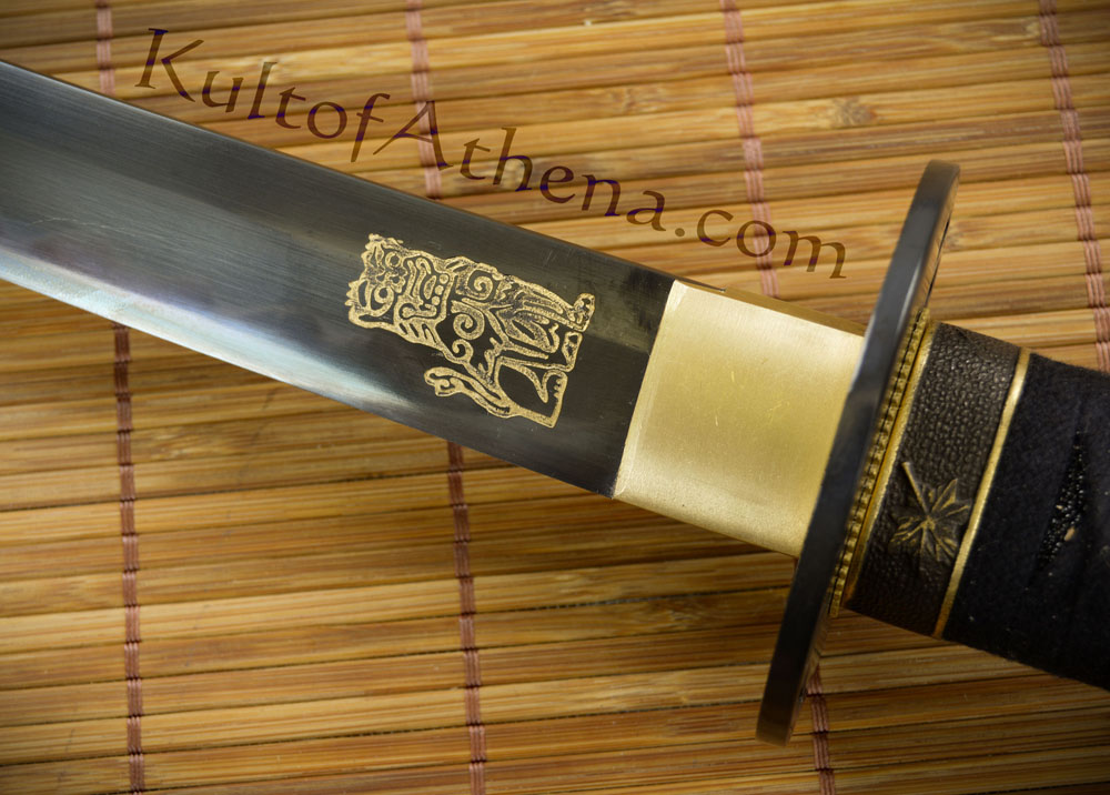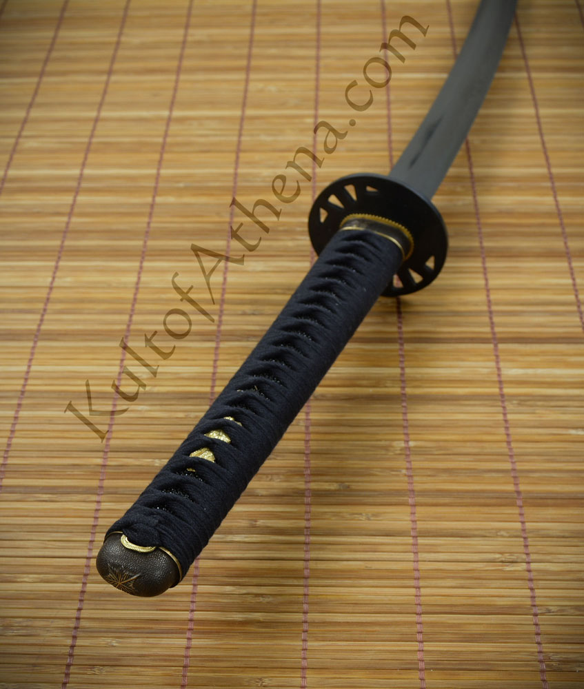 The Hanzo Steel Kill Bill Brides Katana has a differentially-tempered and sharpened blade of 1060 high carbon steel. The blade was finished with a unique coating of darkened titanium. The tsuba is iron and the habaki and seppa are brass. The kashira and fuchi hilt components are antiqued brass. The wooden tsuka has inlaid panels of black lacquered rayskin and a pair of brass menuki. The grip was finished with a grip wrap of black cotton ito.