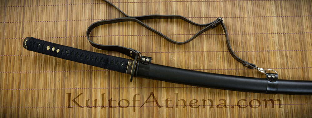 The wooden saya scabbard is overlaid in stitched black leather. It is finished with faux leather bands with metal hanging loops and a matching, adjustable faux leather backstrap.