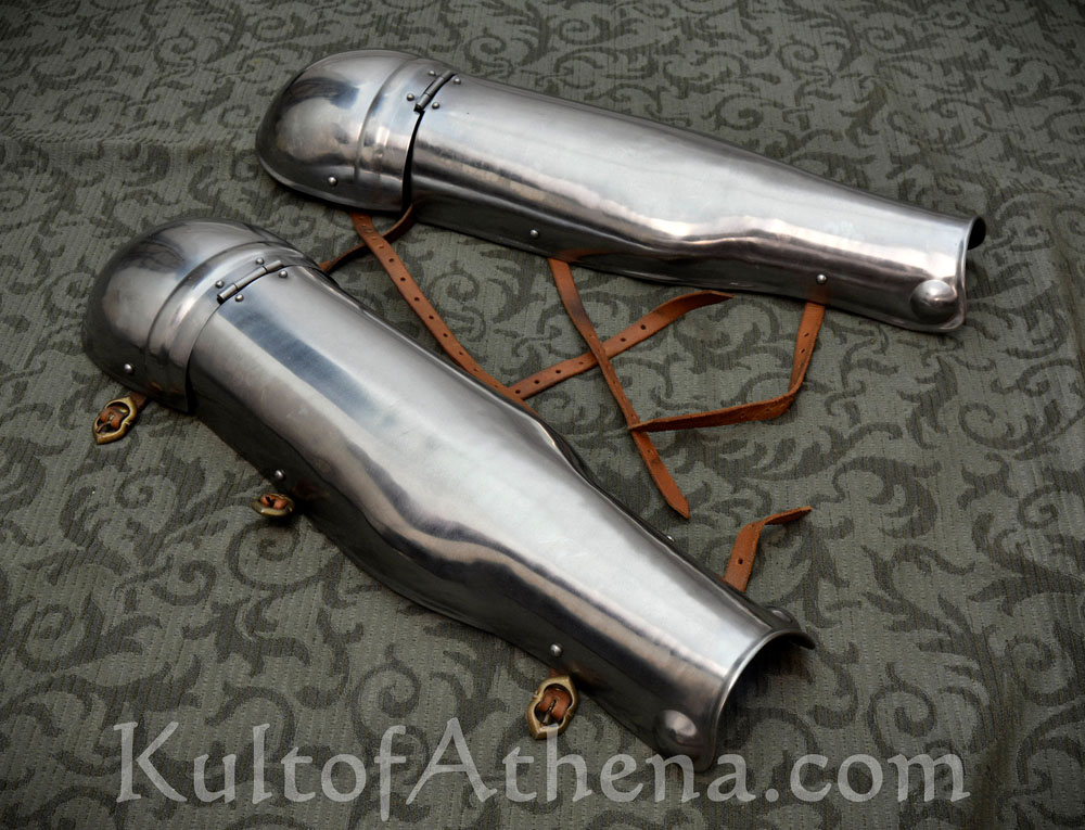 These set of hinged greaves with additional knee armor are crafted from 18 gauge steel; the hinged knee plate gives protection for the knee whilst allowing for a wide range of movement. The armor is fitted to the leg with a set of adjustable antiqued brass buckles and leather straps.