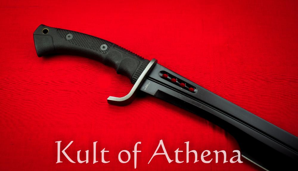 The blade is crafted from 7Cr13 stainless steel, heat-treated for resilience and corrosion resistance. Its recurved, forward-weighted design mirrors the geometry of the ancient Greek kopis, delivering tremendous cutting leverage and penetration. The construction ensures dependable strength throughout the hilt, while the TPR injection-molded grip provides a firm, non-slip hold even in wet or gloved conditions. A curved and darkened stainless steel guard reinforces the hand against impact, and a brass-lined lanyard hole adds a practical option for securing or displaying the weapon. Included is a sheath of thick and tough practical faux leather with strongly stitched construction.