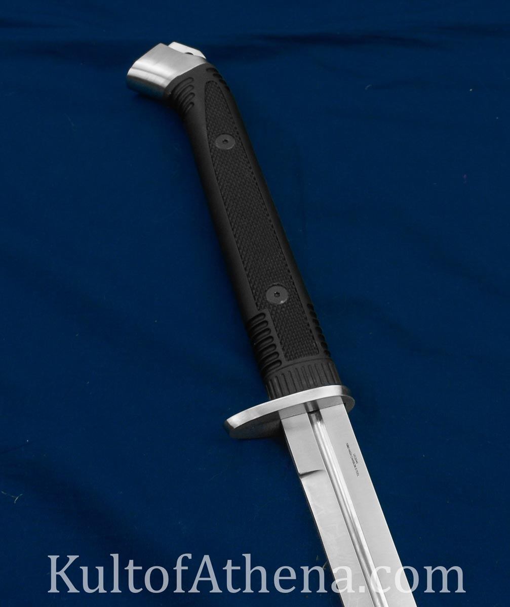 Honshu’s Boshin Double Edge Sword melds the iconic blade styles of the Ninjato and the Kogarasu Maru Tachi into a single sword with practical and modern tactical materials. The blade is tempered 1060 high carbon steel and its unique form combines a thick blade spine for durability which rapidly tapers into a thin, dual edge at the midpoint of the blade; a fine compromise for resilience and the advantages of a second edge.