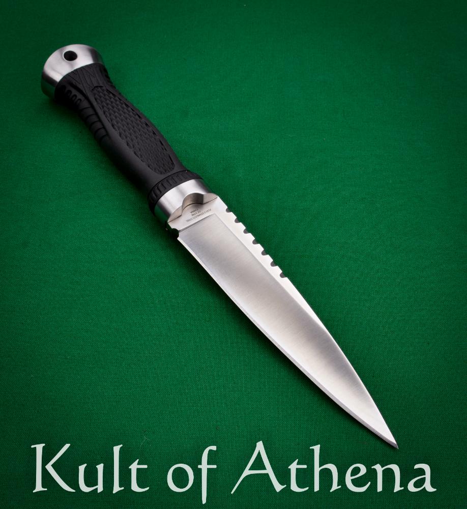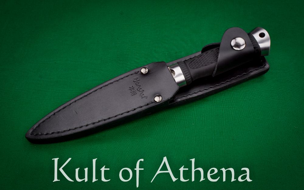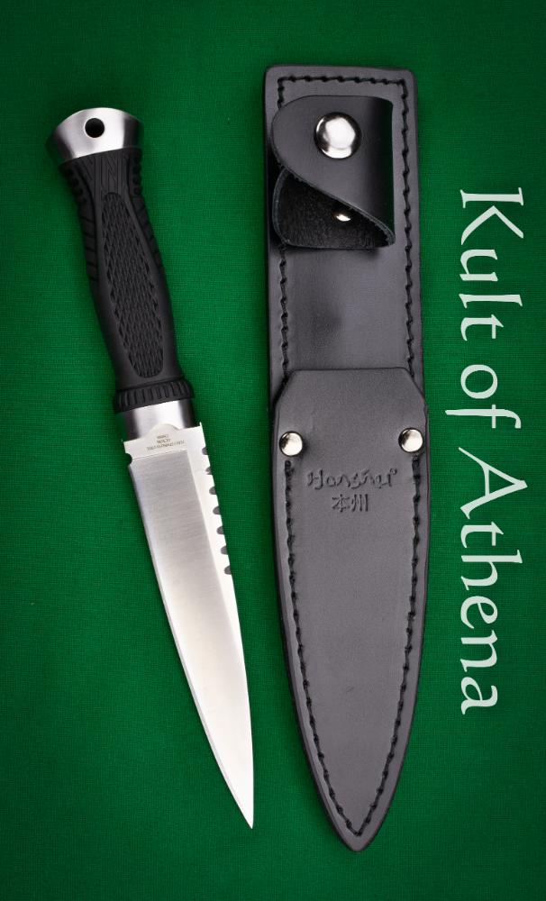 A modern bladed sidearm for the modern highlander, the Honshu Sgian has a stiff and sharp blade of 7Cr13 stainless steel that is functionally adept at quick and decisive piercing and cutting. The dagger has a molded grip crafted from modern hardened thermoplastic rubber which is surmounted by a bolster and pommel cap of steel. The sheath for the dagger is made from thick and tough faux leather with a stitched and riveted construction and completed with a buttoned retaining strap and an integrated belt loop.