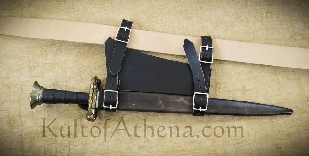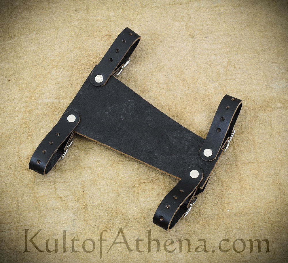 With its four adjustable straps and buckles, this dagger back frog is ideal for hanging a dagger horizontally at your back, or even your front if desired. The straps are widely adjustable to fit your belt and dagger sheath and the dagger frog can be worn with the dagger facing either direction. The frog can be sized to fit a belt width and sheath width of up to 1.5, though there is ample room on the straps to add more sizing holes if needed.