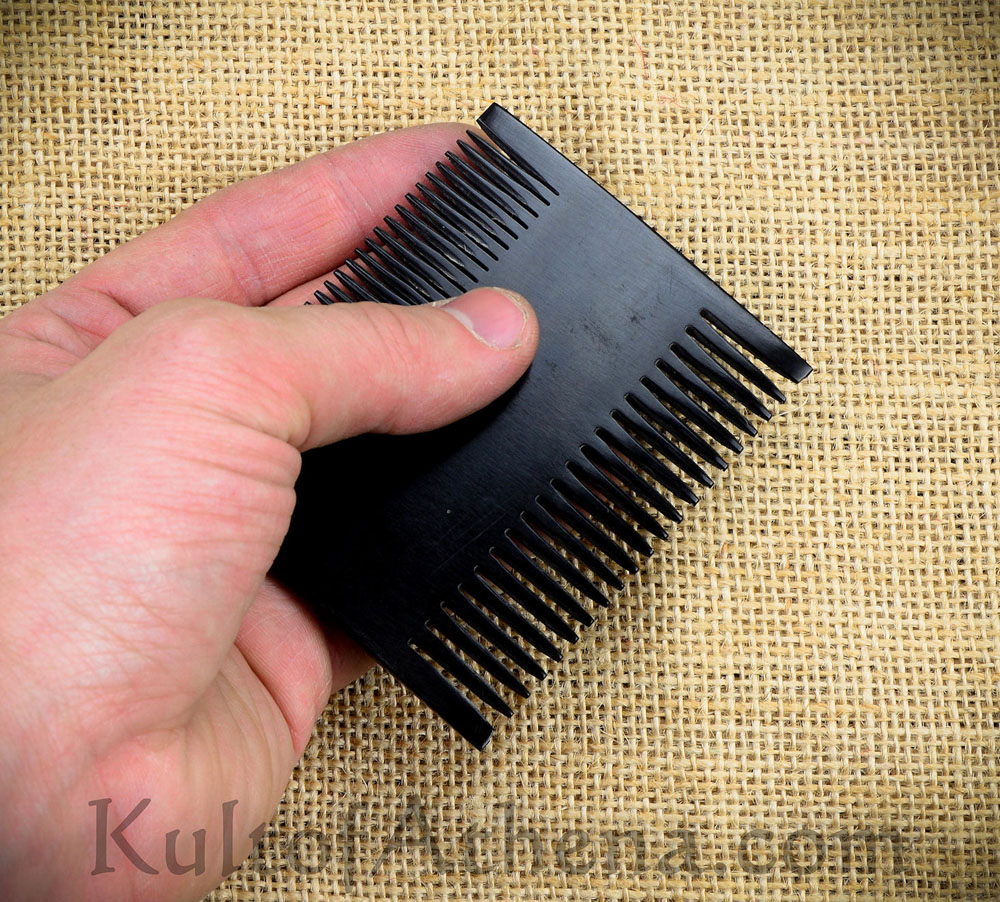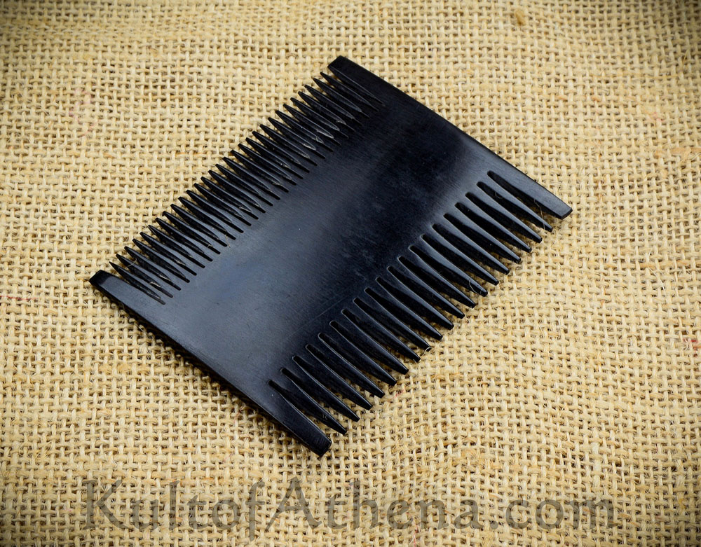 This small dual-sided comb is handcrafted from a single piece of carved animal horn. Pocket sized, it is a useful item for the dark age or medieval traveler – or as a bit of camp kit.
