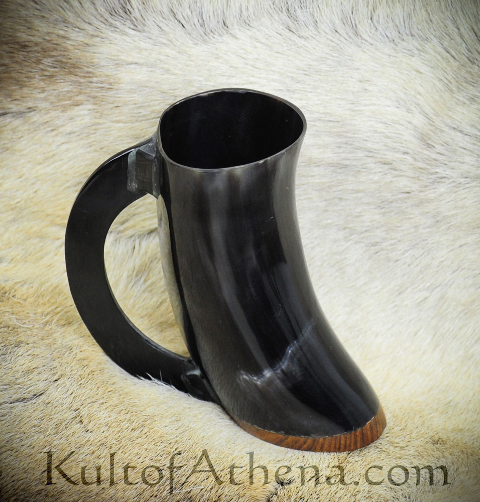 This mug of polished cow horn is capped at the bottom with wood and given a sturdily affixed handle of horn. The interior of the mug is polished and the bottom is sealed.