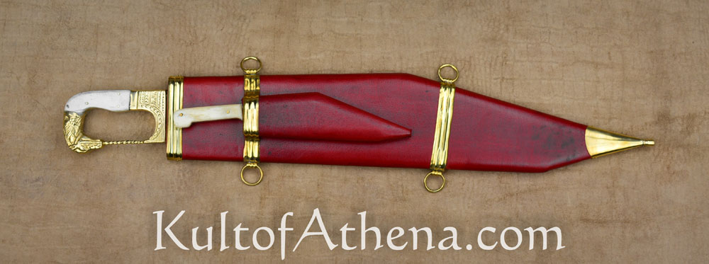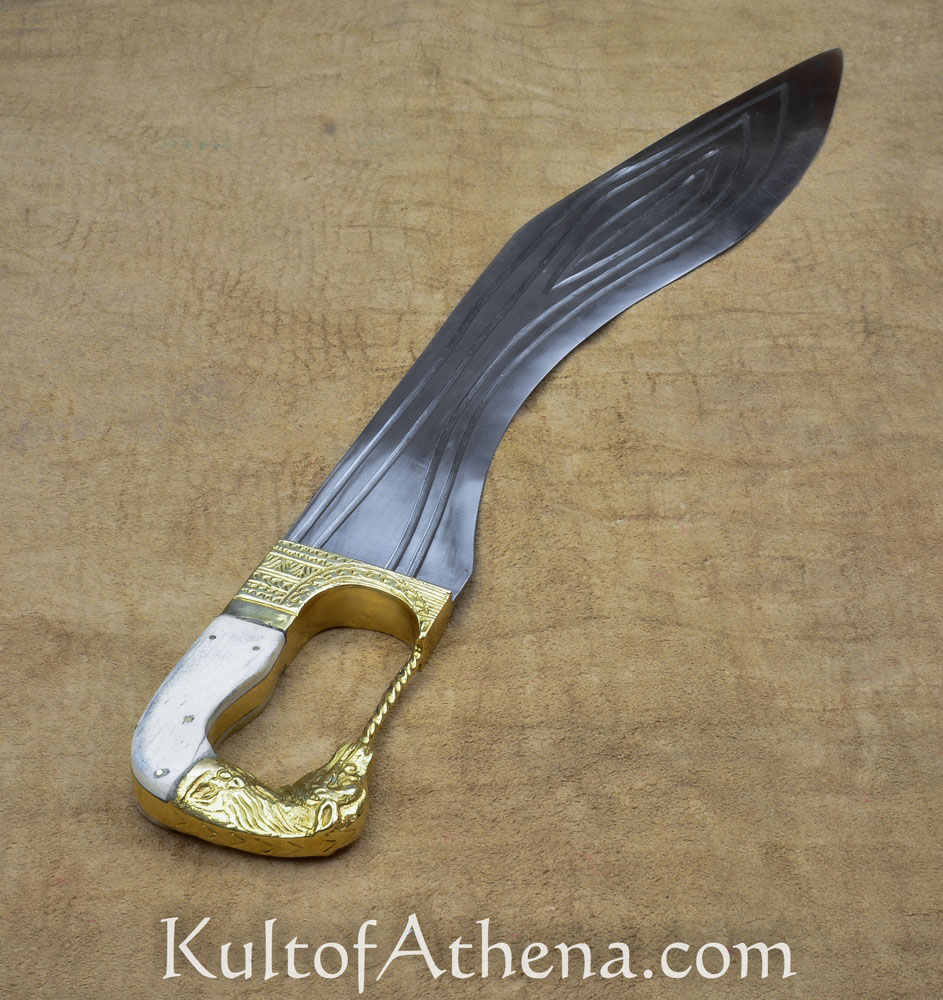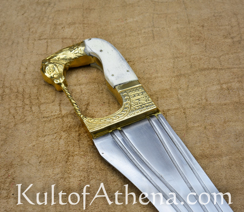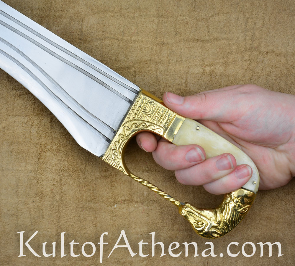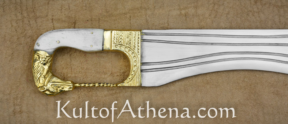 Wonderful item The Horse Head Falcata is a truly excellent piece. In searching the web I found images of an original falcata that is practically an exact match. It is well made, attractive and distinctive. I made my own gold and red braided baldric that compliments it wonderfully and looks terrific. I could not be more pleased.