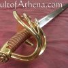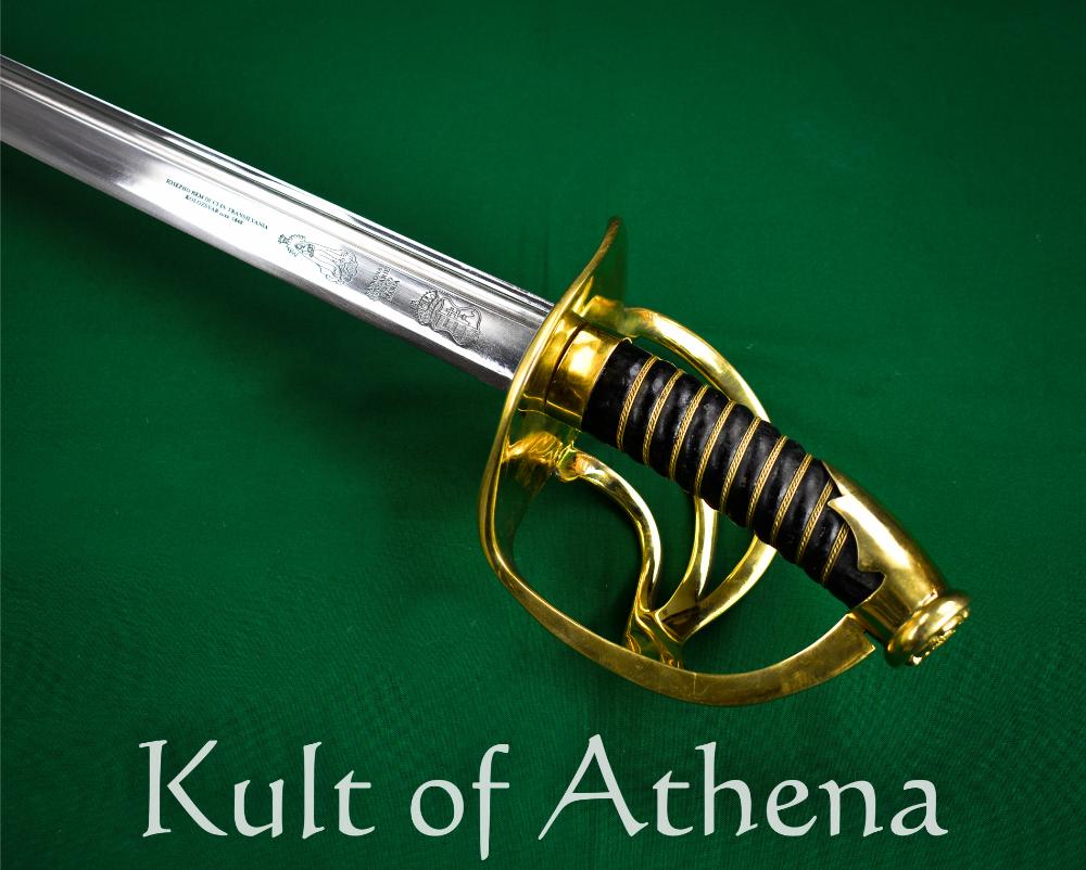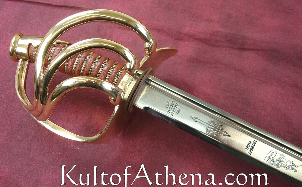 If your a thruster this sword’s for you, definitely a heavy heavy calvalry sword. I think this is it, my favorite sword. Thick, yes, very, but it still flexes well and returns straight as before, the fuller is done nice straight and even, the Koa sharpening service did a nice job, thank you koa, and there’s no waveyness looking down the blade, I didn’t think I could get a sword with a blade this nice, the handle is black not brown as in Koa’s pictures, another seller has this sword with the black handle and they state th steel is 1065 not en9 as koa states so that would be a plus for me, brass guard is done nicely, and unbelievably the cuts in the brass for the tang fit almost perfectly and the blade is seated very well on the guard, the handle is comfortable but oh oh, the bottom side of the leather guard got some glue or other substance on it and disfigured the leather, oh well, I can live with that, other than that this sword is great, very nice, the scabbard is excellent, if the sword makes your arm tired you can use the scabbard in its place, just sharpen the protective end.