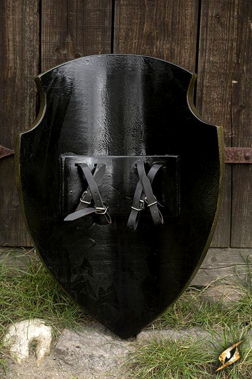 Epic Armourys Imperial Shield is a semi-curved gothic latex shield inspired by a late 13th century kite shield. Hand painted and sculpted with careful detail, this shield features a studded metal rim and a laurel-crowned skull and banner on the shields face.