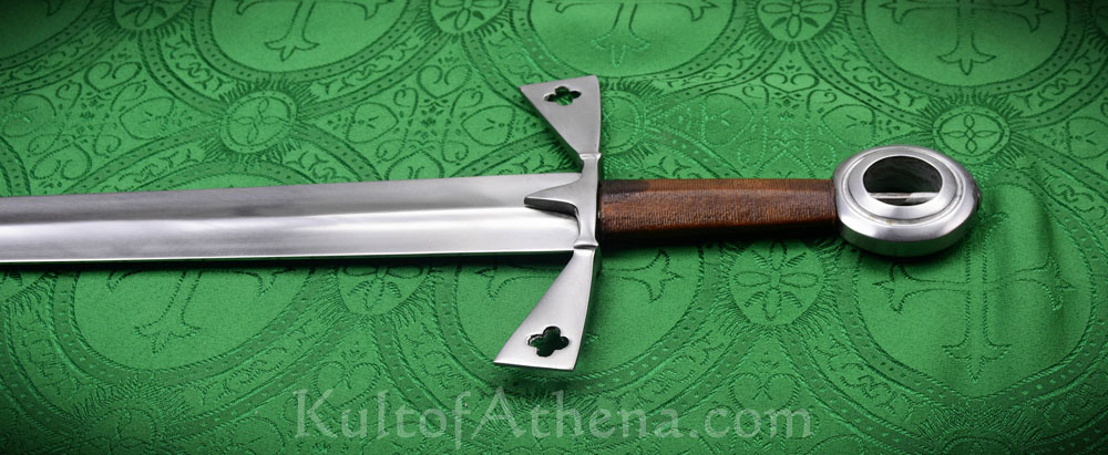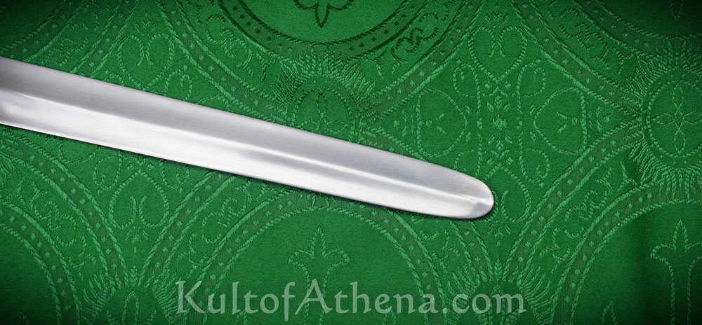 The Gaelic-Norse Arming Sword has the characteristic ring pommel and winged quillons that are iconic of medieval Irish swords; the blade is forged from high carbon steel and given thick edges and a rounded tip to make it suitable for withstanding the rigors of sport and stage combat. The blade has a hollow-ground cross section which gives it a strong spine and reduced weight.