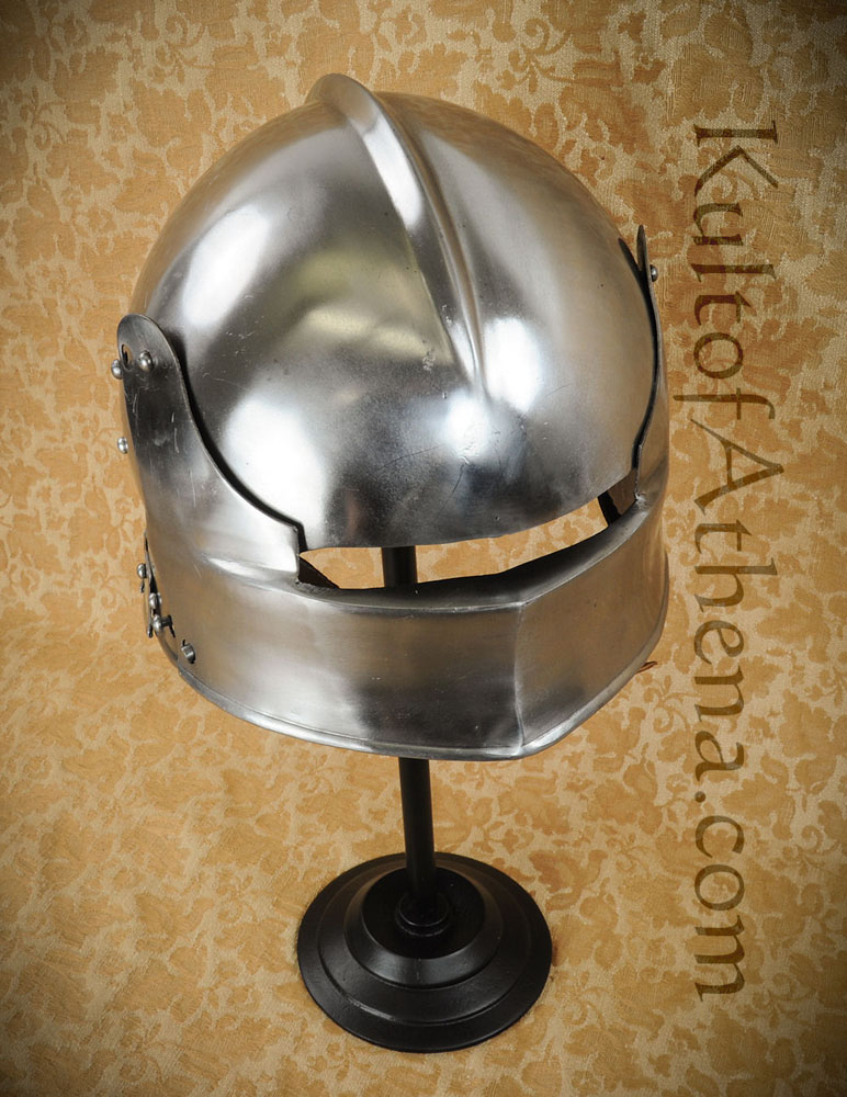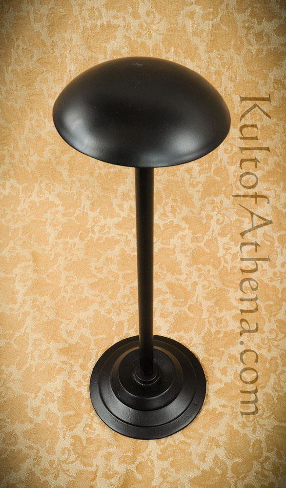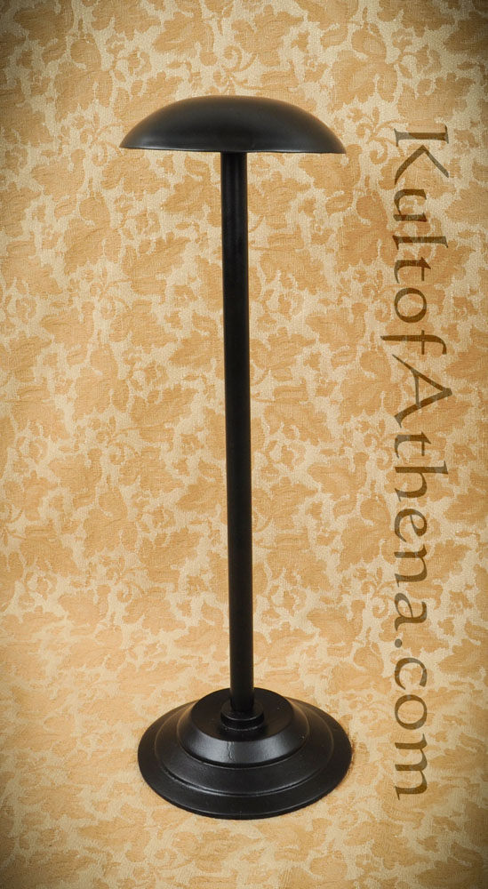 This helmet stand is made from blackened iron. The stand is in three parts; top, shaft and base and they are easily screwed together for assembly.