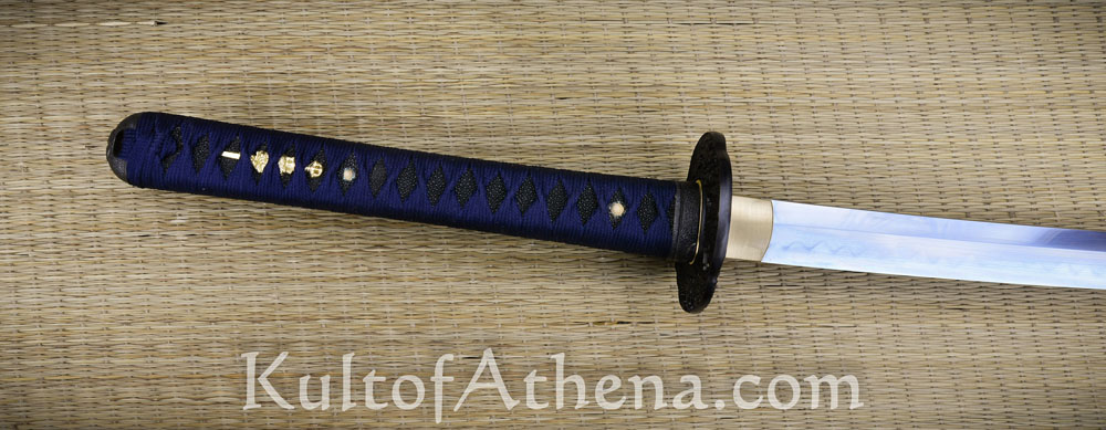 The blade is forged from highly polished and sharpened T10 high carbon steel and its hamon was created by clay-tempering the blade to imbue it with a very hard edge. The turbulent hamon is a fine match for the roiling waves and coiling serpent upon the tsuba. The blade omits a bo-hi groove in favor of keeping the full potential of its decisive cutting power. The tip has a geometric yokote and an enlarged O-Kissaki tip.