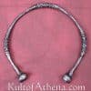 This Celtic Torc of hand-forged iron can be adjusted for wear. It is coated with an anti-corrosive lacquer.