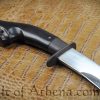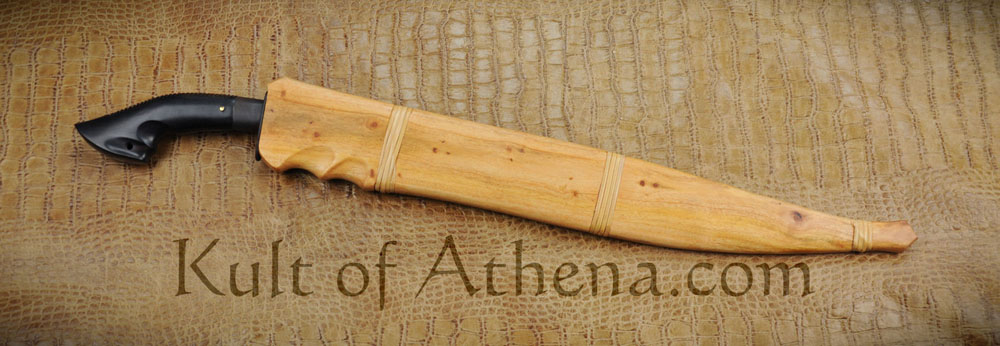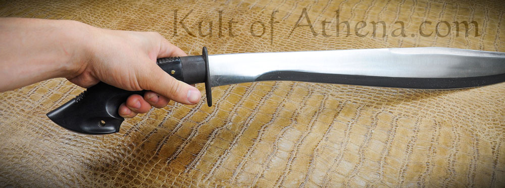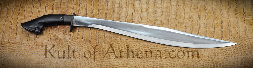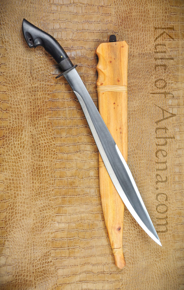 This blade’s a beast! The second sword I owned. This one’s an absolute tank. I had to sharpen it myself to start getting clean cuts, though the factory edge is better than a sharpening service, it’s still not quite sharp enough to cut very nicely. Even though this blade is short and quite light, the recurve shape and longer handle allows you to get enough leverage for powerful slashes! After accidentally cutting off a plank off of my practice stool, I got very confident in the build of this sword as it was still rock solid and… Abused it by slashing into the plank directly on. It took it quite well, not even really dulling the blade and the construction is still solid! Would make a great woods machete. If you have an interest in Phillipino blades or Kopesh shaped swords, this one is worth it!