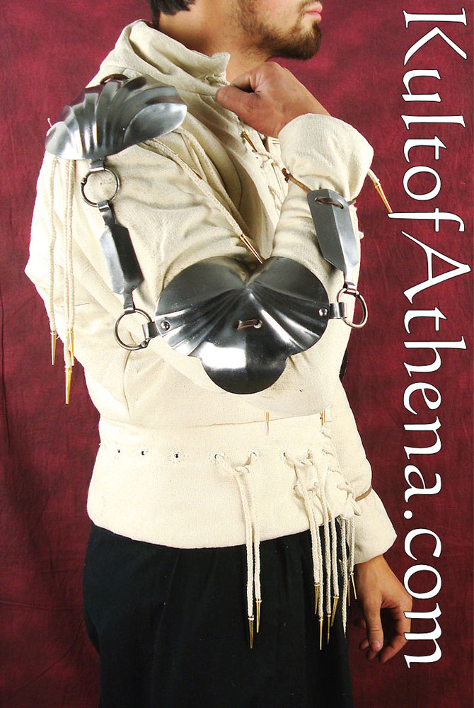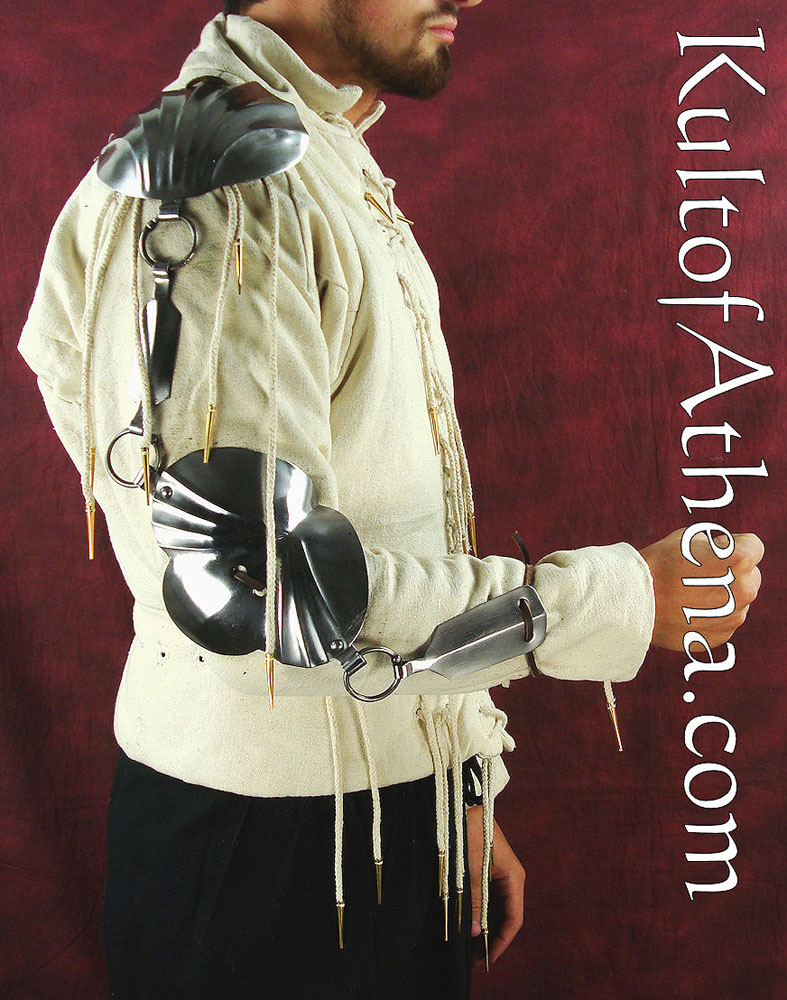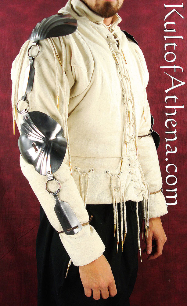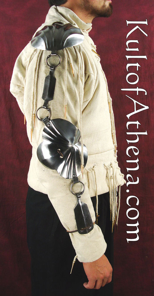 A set of jack chains might have often been the arm and shoulder defense for some professional men-at-arms and the levied militia soldiery of the late Medieval period who could not afford to deliver a weighty purse of coin to the armorsmith. A jack chain is quite simply some smaller plates of armor articulated by steel rings, tied and fitted over the arms of a padded gambeson. This was a lower cost upper-body defense that provided some plate in the areas most likely to receive a cutting strike.