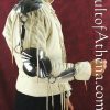 A jack chain on the shoulders and arms prevents a sword or the cutting edge of a polearm from cutting into the arm deeply – though it may not look very protective at a glance it works by stopping a blade at the angles a cut is most likely to come from. It is claimed by many that a study on jack chains showed that they prevented 80% of cuts (we have been unable to find the source for this information).