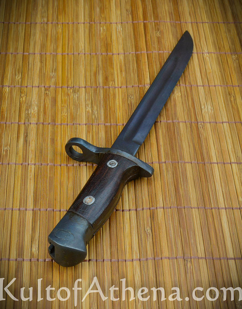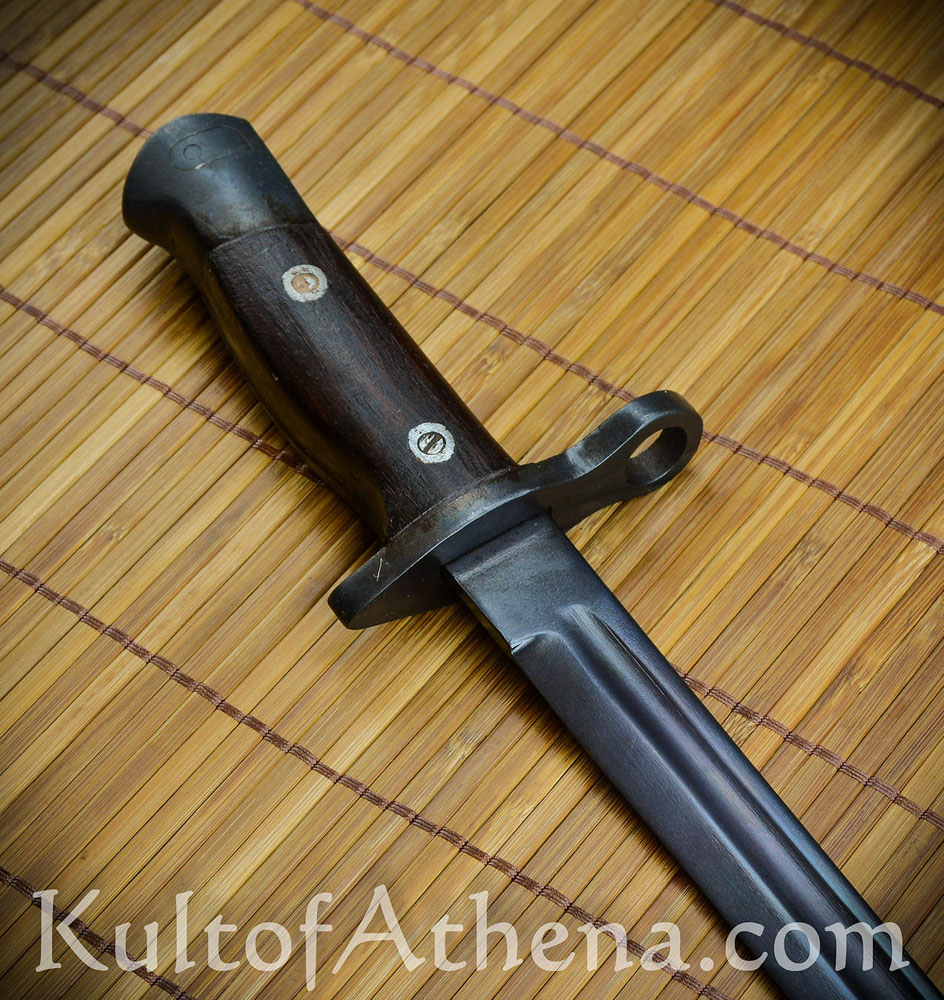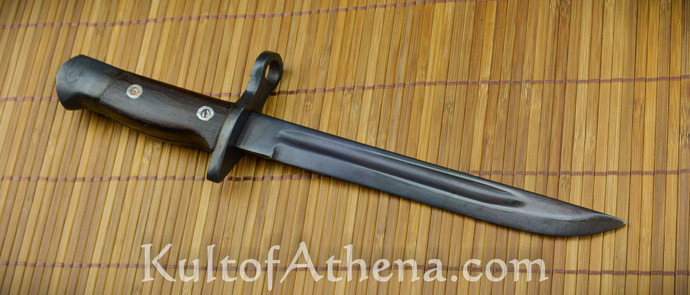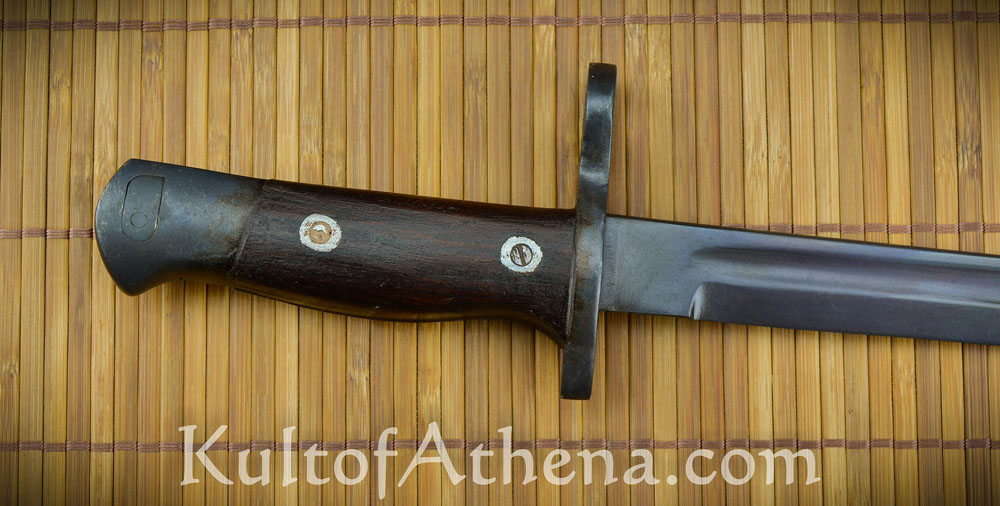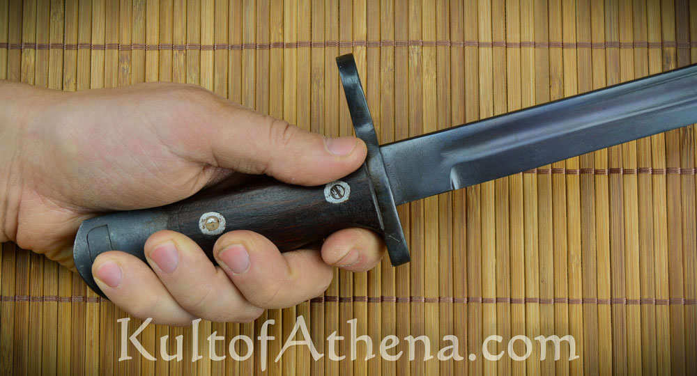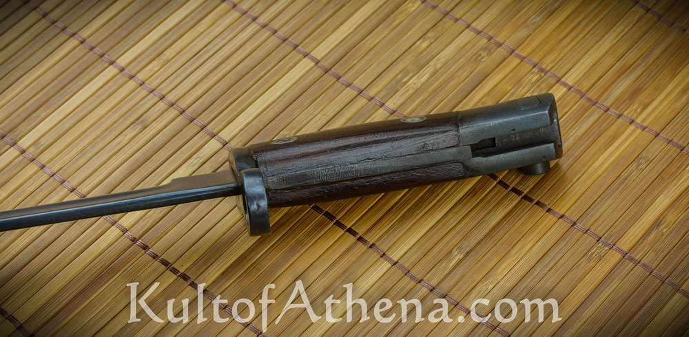This replica of the Arisaka Bayonet issued to WWII Japanese Paratroopers has a blade of high carbon steel with a deeply blued finish ideal for nighttime operations. The guard with rifle lug and the pommel are likewise blued steel; a spring pin and catch in the pommel allows for the bayonet to be fitted to the Paratroopers rifle. The grip is finished with two antique-stained halves of wood which are stoutly riveted to the blade tang. Included is a scabbard of blued steel.