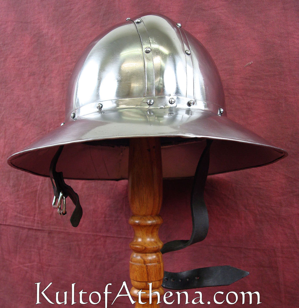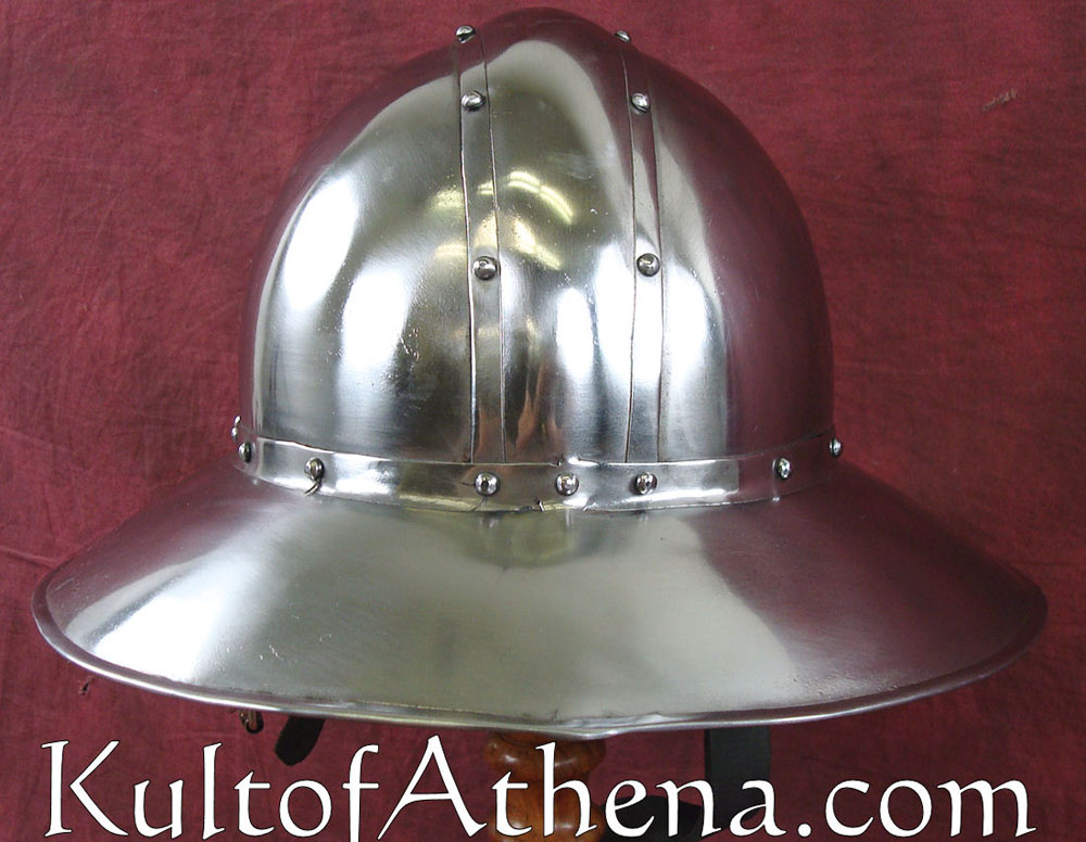 The Kettle helmet is no-nonsense utilitarian head-protection for the medieval infantryman and archer. The dome protects the head well and the wide brim protects and deflects downward blows as well as keeping the heat of the sun off the face. Both hearing and sight are unobstructed, leaving the infantrymans senses sharp to respond to mass orders. The helm is also good for the siege, protecting both attackers and defenders from sky-falling arrows and ground-bound debris.