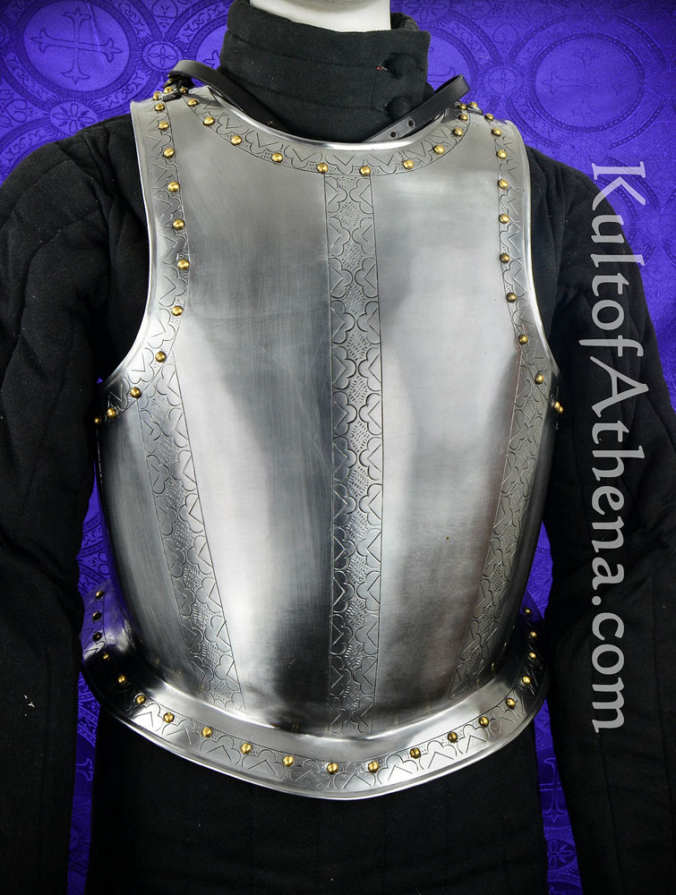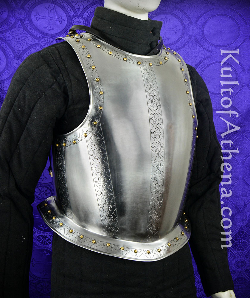 The Kings Breastplate is crafted from 18 gauge steel; the eye-catching engravings which trim and adorn this breastplate were laboriously inscribed by hand and chisel. The breastplate is further embellished with brass edging studs.