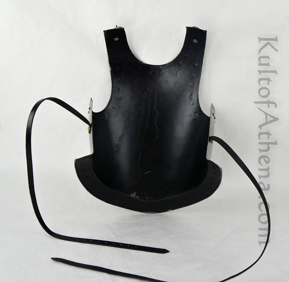 A pair of leather straps and brass buckles are riveted onto the breastplate and allow it to be buckled across the back for wear and adjusted to fit. The interior is blackened.