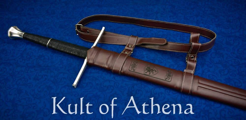 The long grip that is over 9″ in length gives impressive cutting leverage and aids in giving the blade a lively balance of only 2.25″ above the hilt. The guard and pommel are stainless steel and the wood grip is tightly bound in cord and competed with a center steel ring. The full tang of the blade is peened over the pommel for a solid overall construction. Included is a wooden scabbard which is wrapped in stitched faux leather with etched heraldric embellishment and a stainless steel chape. A sword belt and hangers of matched faux leather completes the sword for a full and ready to use package.