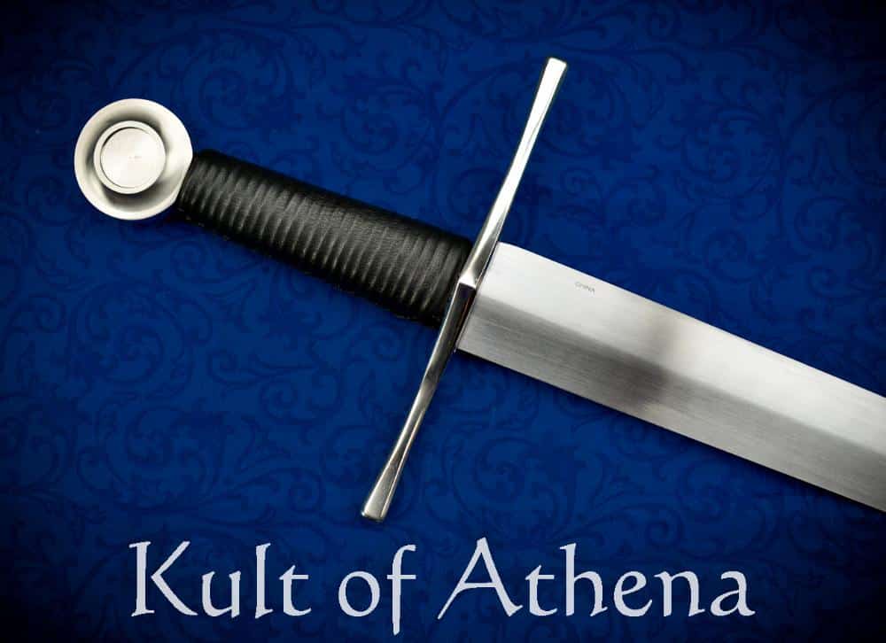 Forged from 1045 high carbon steel, the blade undergoes heat treatment to achieve a hard edge while maintaining flexibility to absorb impacts and has a hardness of 52-54 HRc. The diamond cross section blade is suitable for both cutting and thrusting alike. The guard and pommel are made from stainless steel and the full-tang of the blade extends into the handle and is secured with a recessed nut pommel assembly. The grip is bound in cord and overlaid in stitched black faux leather. The black scabbard is made from wood which is tightly fitted with a matched wrap of stitched faux leather which includes a thin leather sword belt to match.