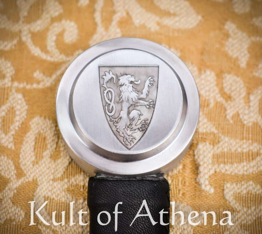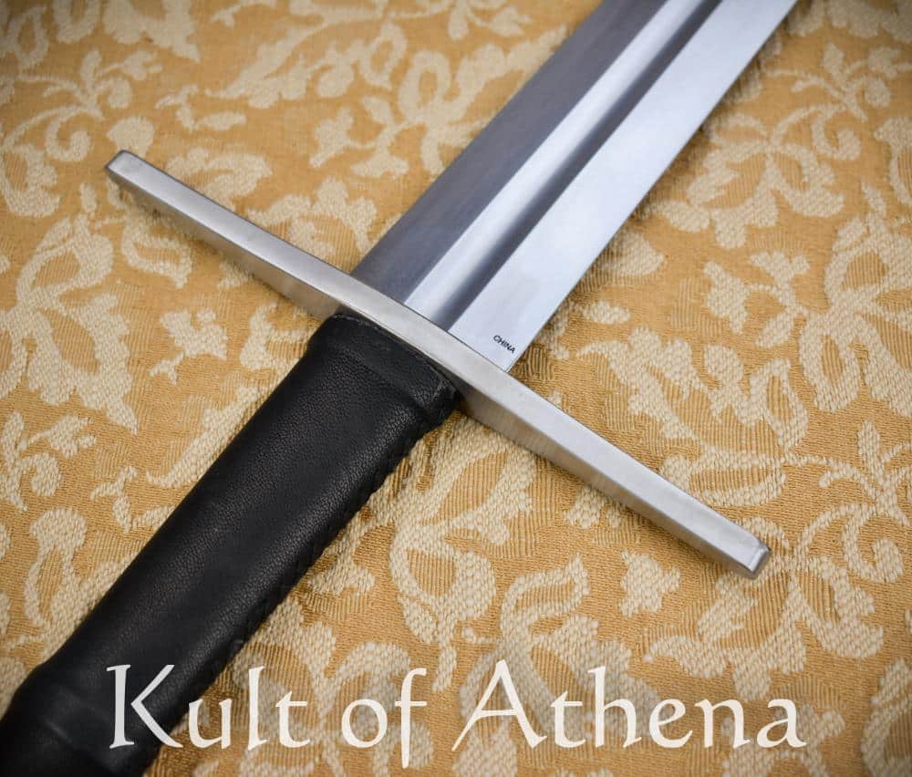The hilt is constructed with a sturdy crossguard and a wheel of stainless steel with a heraldric pommel that lend it a distinctly medieval character. The handle is faux leather wrapped for improved grip ensuring secure handling whether it is used for training, drills, or as a centerpiece for a collection. The full tang grip goes entirely through the handle and is anchored over the pommel with a peened construction. A matching scabbard, clad in faux leather with a carrying strap, completes the sword set making it easy to transport or display.