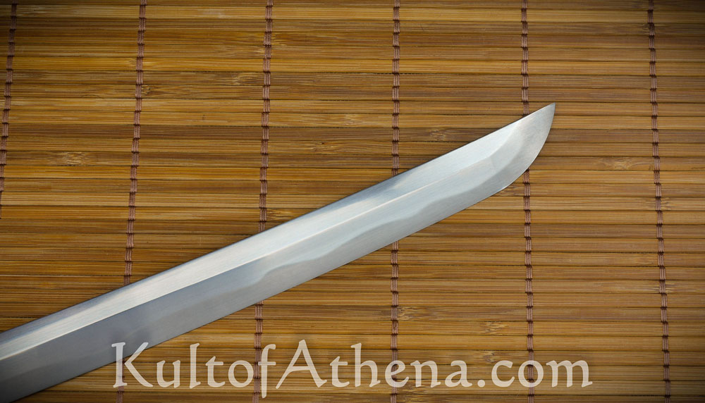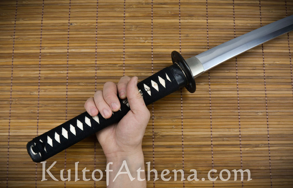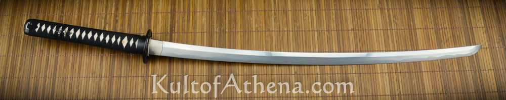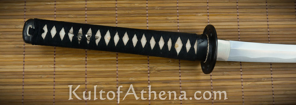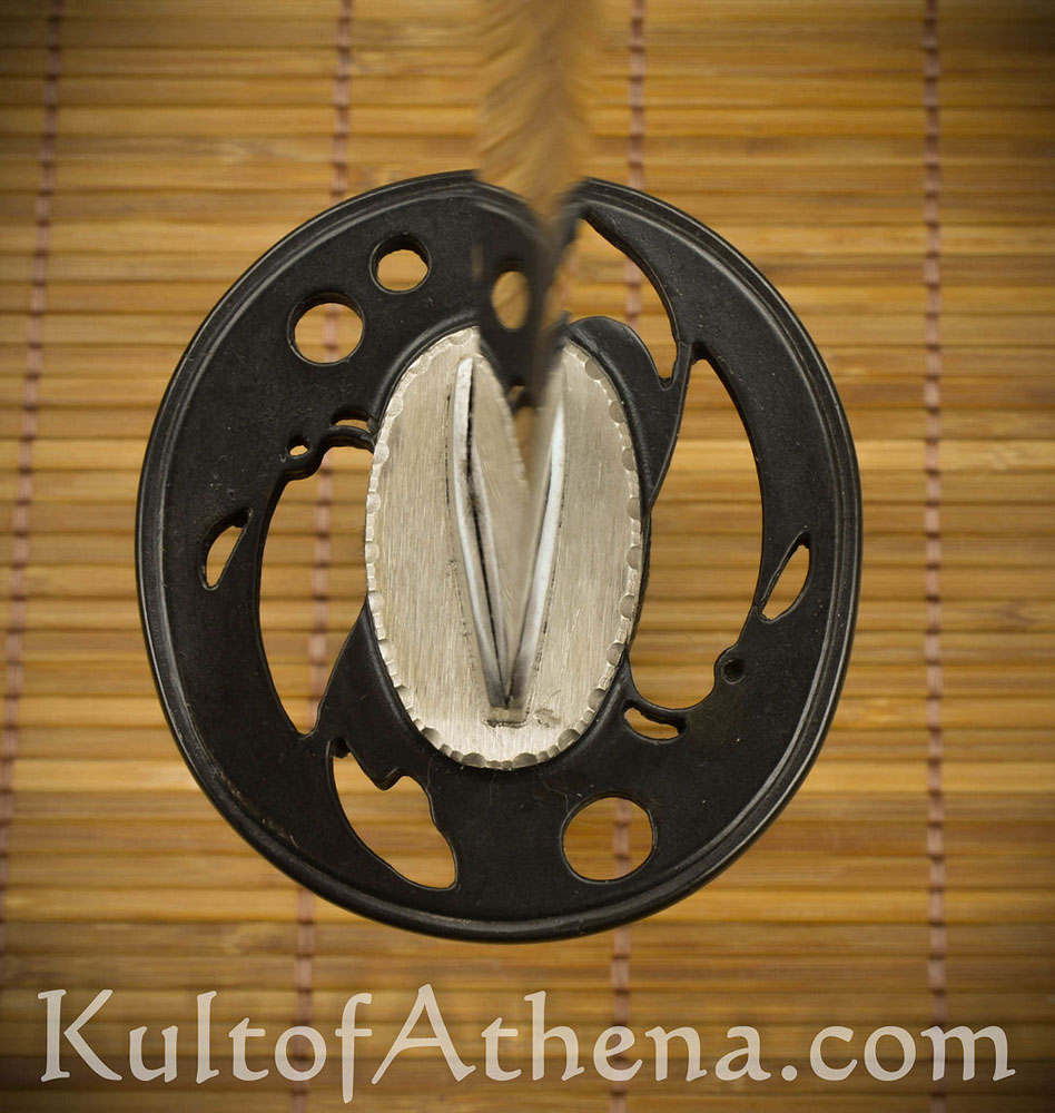 The habaki and seppa fittings are silver and the wooden tsuka grip has panels of inlaid, genuine rayskin. The tsuka ito grip wrap is well-knotted and silver menuki lie beneath the grip folds. The saya scabbard is carved to fit from wood with a glossy lacquered finish and is complete with buffalo horn fittings and a two-tone red and white sageo cord. A cloth sword bag is included.Elegant in its simplicity, yet profound in the depth of its ancient symbolism, this katana is ideal for the warrior who has made the commitment to weather the trials that lie ahead with a sword that mirrors himself at the side.