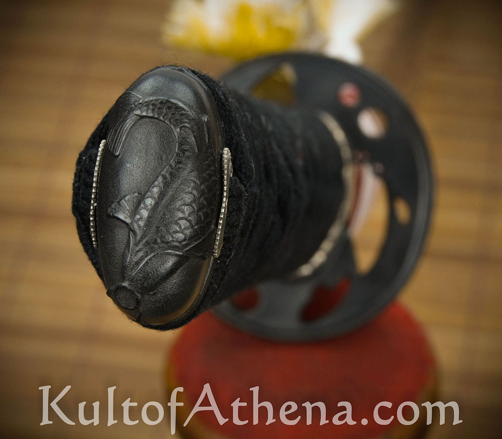 This sword embodies that tale which inspired Samurai with a Koi-themed tsuba, fuchi and kashira hilt fittings of blackened steel. Not to be outdone, the very functional blade of this katana is forged from T10 high carbon steel and was differentially tempered which left a vibrant, wave-like hamon upon its edge