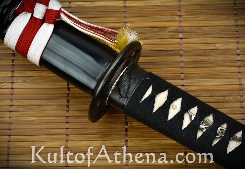 The Kohaku Katana from Dragon King melds a powerful symbolic motif with well-crafted fittings in a humble, yet elegant form. The Kohaku Koi is no mere ornament of a fish to a samurai – it is a strong swimmer that will even challenge waterfalls in its journey upriver. There is an ancient tale of Japan which tells of a school of Golden Koi who swam up a mighty river. When they reached the waterfall at its end most of the Koi stopped and the current took them back whence they came. A few Koi jumped, again and again to scale the waterfall and were successful until jealous Oni demons made the waterfall taller solely out of spite. It was so tall that after one hundred years only a single Koi scaled the falls. Exhausted, yet triumphant, that single Golden Koi was transformed into a grand Golden Dragon. This is what the Koi meant to a samurai – it was the battle against great adversity with the knowledge that perseverance marked the arduous path to Victory.