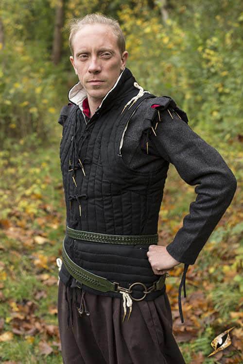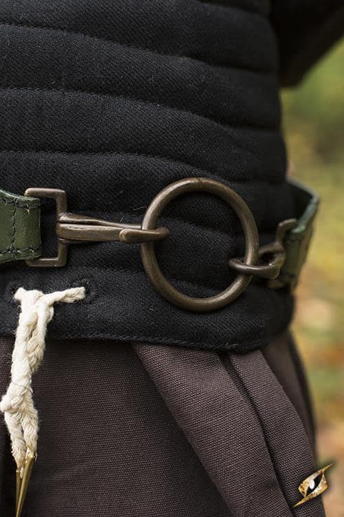 This sword belt is composed of two linked belts of leather with antiqued brass hardware and is worn by wrapping it around the waist twice and includes a large antiqued brass ring for your sword or weapon, as well as other rings to accommodate other weapons or equipment. The belt leather is backed by softer material for comfort.