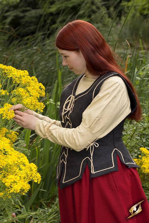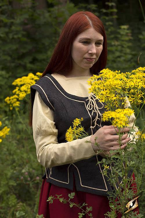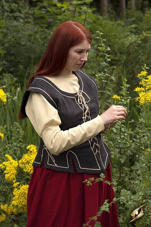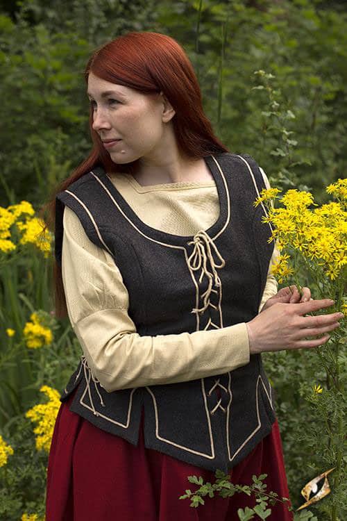 Epic Armourys Ladies Vest is an adorned, sleeveless outer garment with round neck designed to add interest and shape to a ladys costume. Specifically tailored to the female body, wear this vest with pants or skirt–both look great! Made from a strong and natural wool blend, this 16th century garment curves around the hips before meeting low over the abdomen. A contrasting trim along the edges adds beautiful personality to this vest.