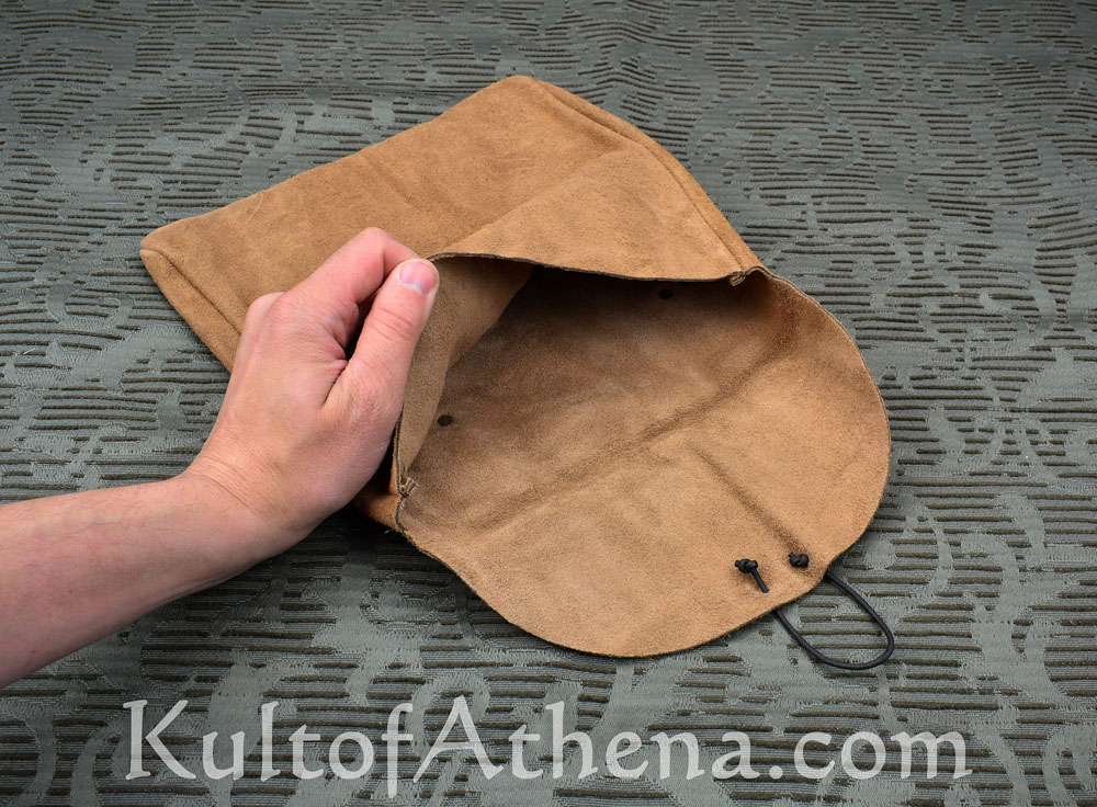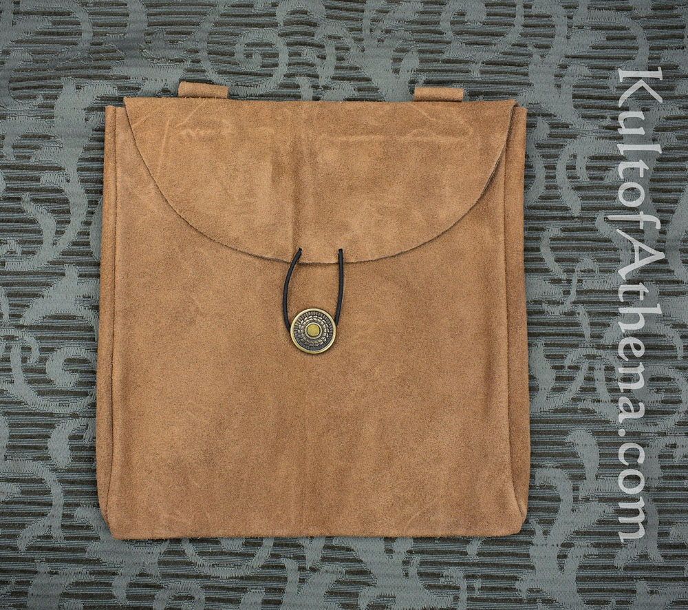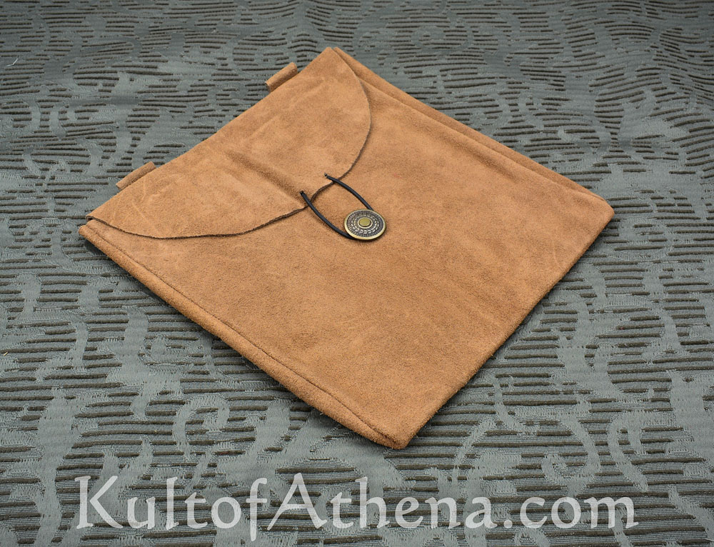 This large medieval belt pouch is crafted from supple suede leather and is easily worn on your belt with its pair of integrated belt loops. A simple brass medallion and leather cord act as a secure clasp to secure your valuables. This pouch is excellent for carrying your coins, rations, camp supply, journal, and all and sundry for the alchemist or herbalist. It is also a great way to discreetly carry your modern phone, wallet and other goods when in full reenactment kit or costume.