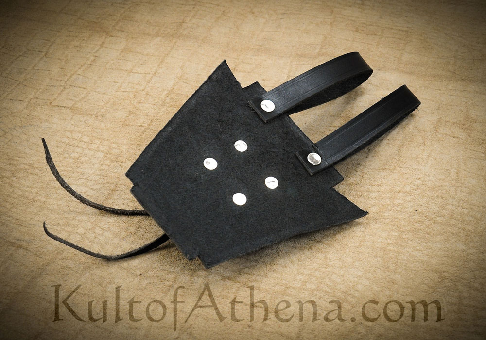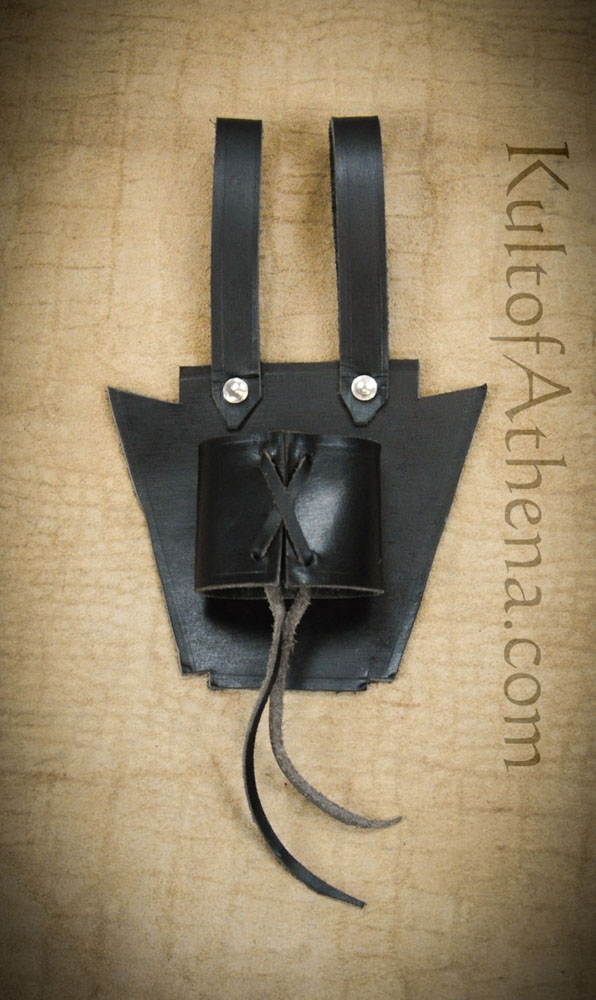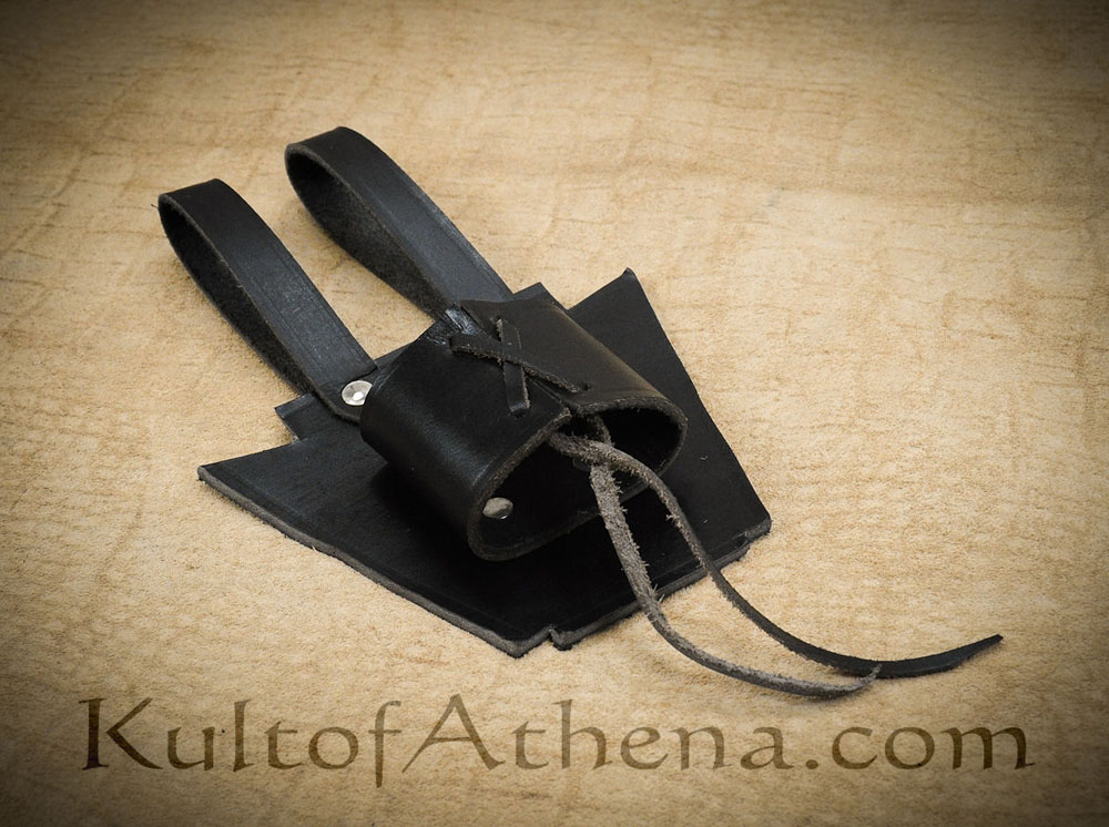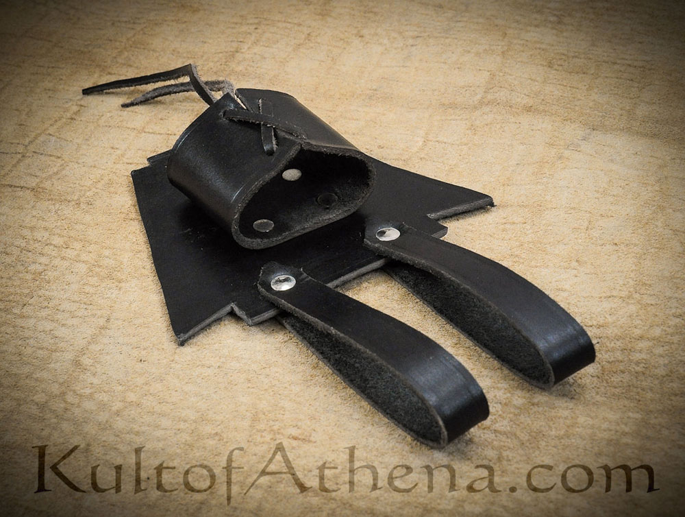 This frog can be used to sling a sword or axe from the belt. It is made from sturdy leather constructed with steel rivets. The weapon holder has an internal circumference of about 6 – it can be adjusted to become wider by adjusting the lacing.