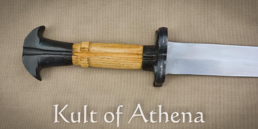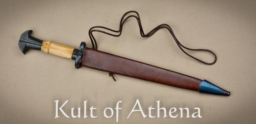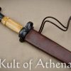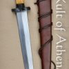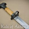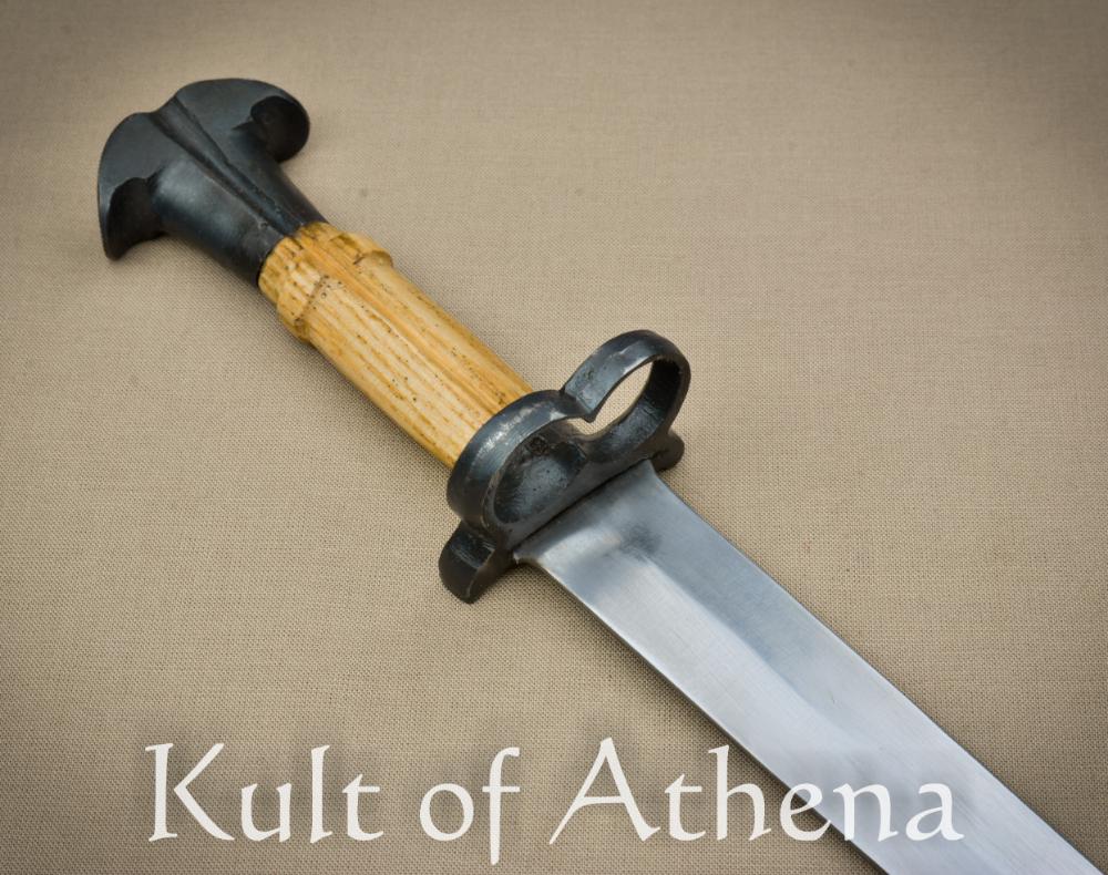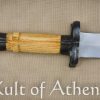 The blade is forged from C60 high carbon steel which is tempered. The guard and pommel are of blackened steel and the grip is carved wood; a solid peen over the pommel anchors the blade into the hilt. Included with the dagger is a sheath made from thick leather with a matching blackened steel chape and a leather hanging cord.