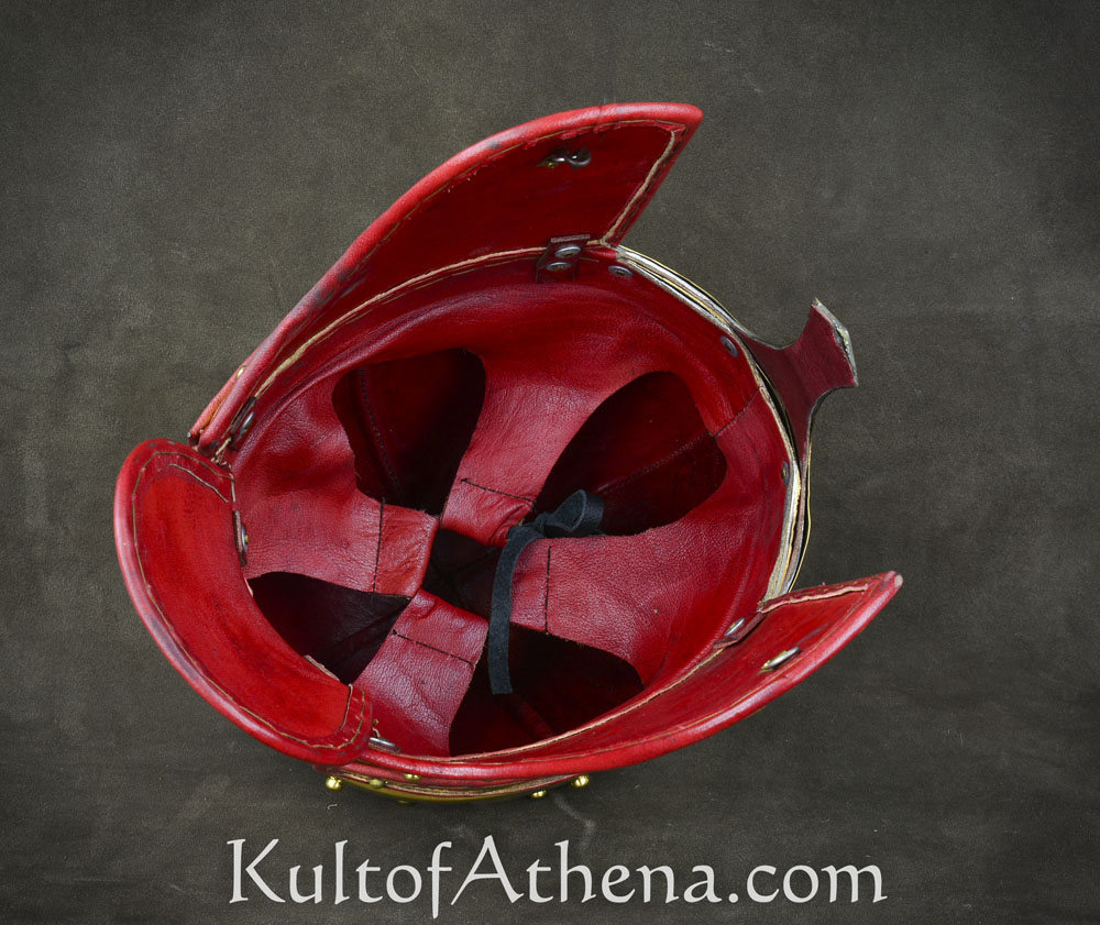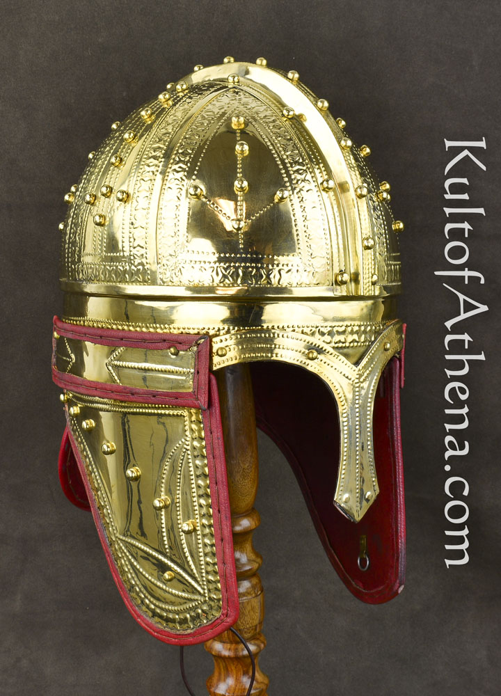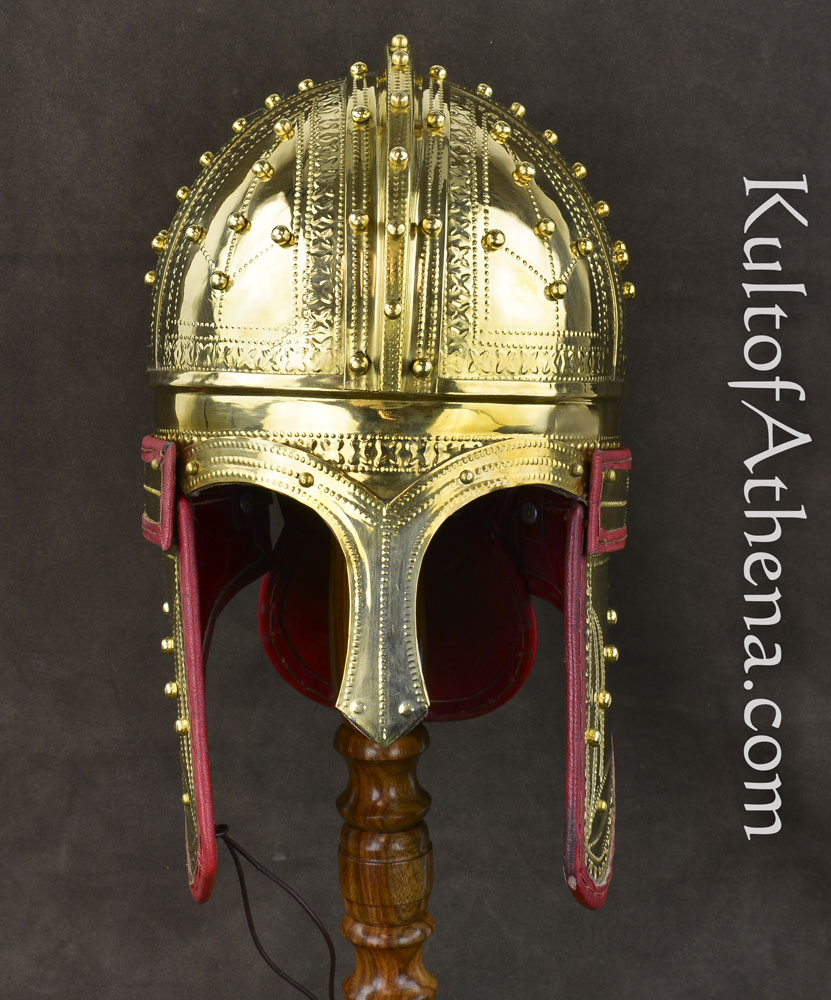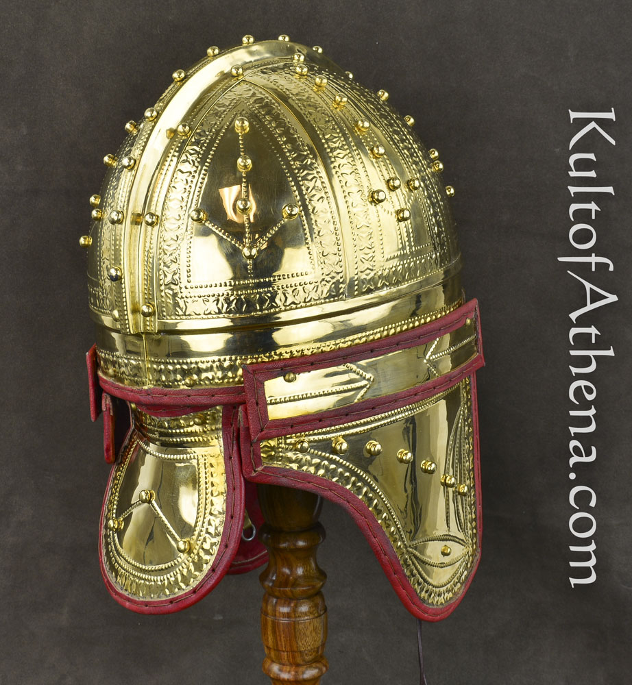 The Late Roman Brass Deurne Helmet is based on an historic example found in Deurne, Netherlands. The original was gilt in silver and gold. This version is made of solid brass with huge amounts of embossed details. Leather lined and fully wearable.